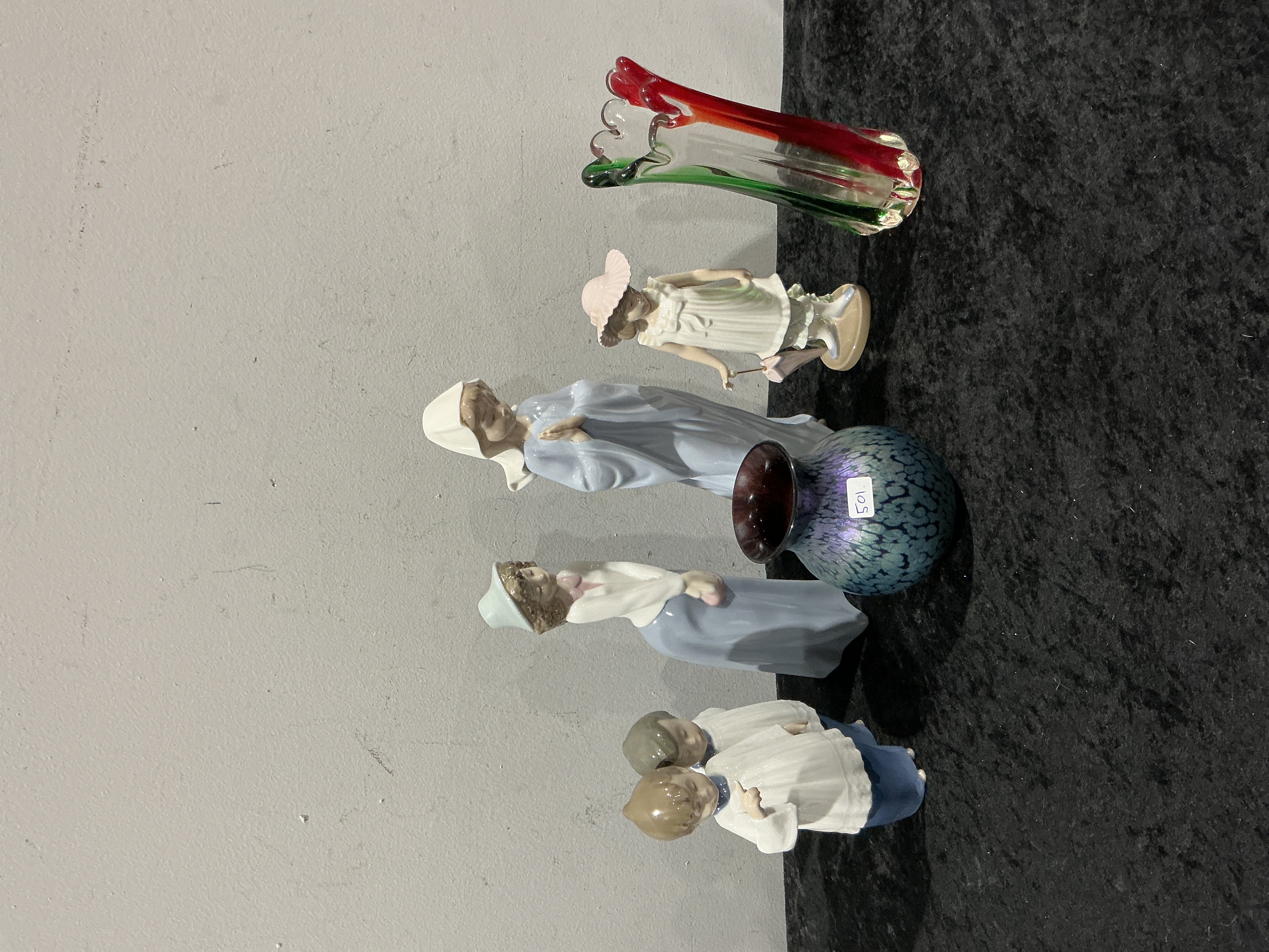 This collection features several glazed porcelain figurines by NAO by Lladro and two art glass vessels. The porcelain figures include subjects identified as Mary Nativity, Our Lady with Flowers, and an Ingenue Woman, all finished in characteristic soft pastel glazes. Each porcelain piece is marked with the NAO stamp on the base. The glass items comprise a small iridescent blue-green vase with a mottled surface and a tall flared vase featuring a red and green interior. The iridescent vase retains a white auction sticker numbered 501.