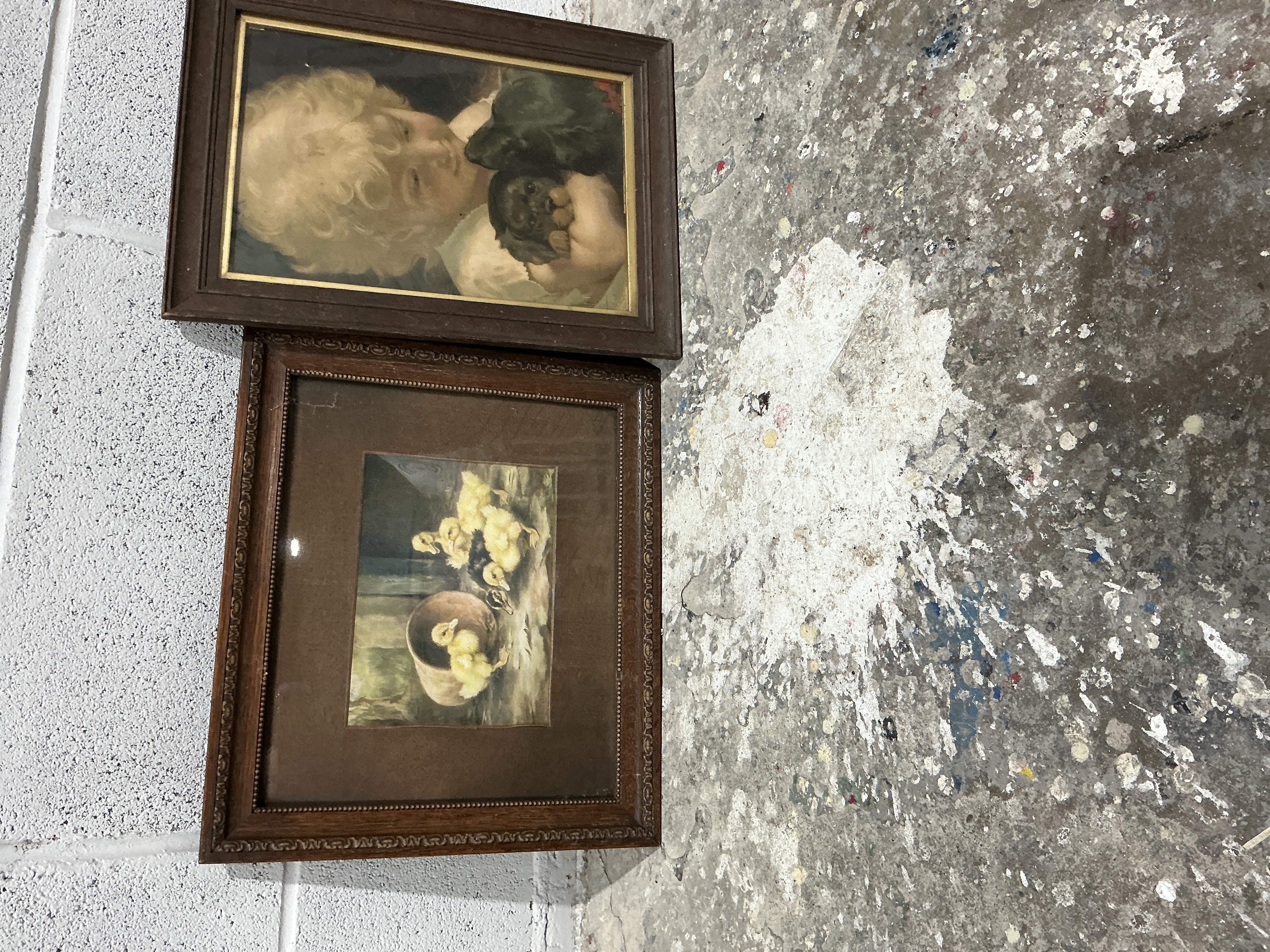 This lot comprises two vintage-style framed prints. The first is a vertical portrait of a fair-haired child holding a dark-coloured puppy, housed in a plain dark wood frame with a gold-coloured inner fillet. The second is a horizontal print of yellow ducklings, one inside a ceramic bowl, featuring an ornate carved dark wood frame with a wide brown mat and glass protection. These are decorative art pieces; no brand, model numbers, or artist signatures were identified during inspection.