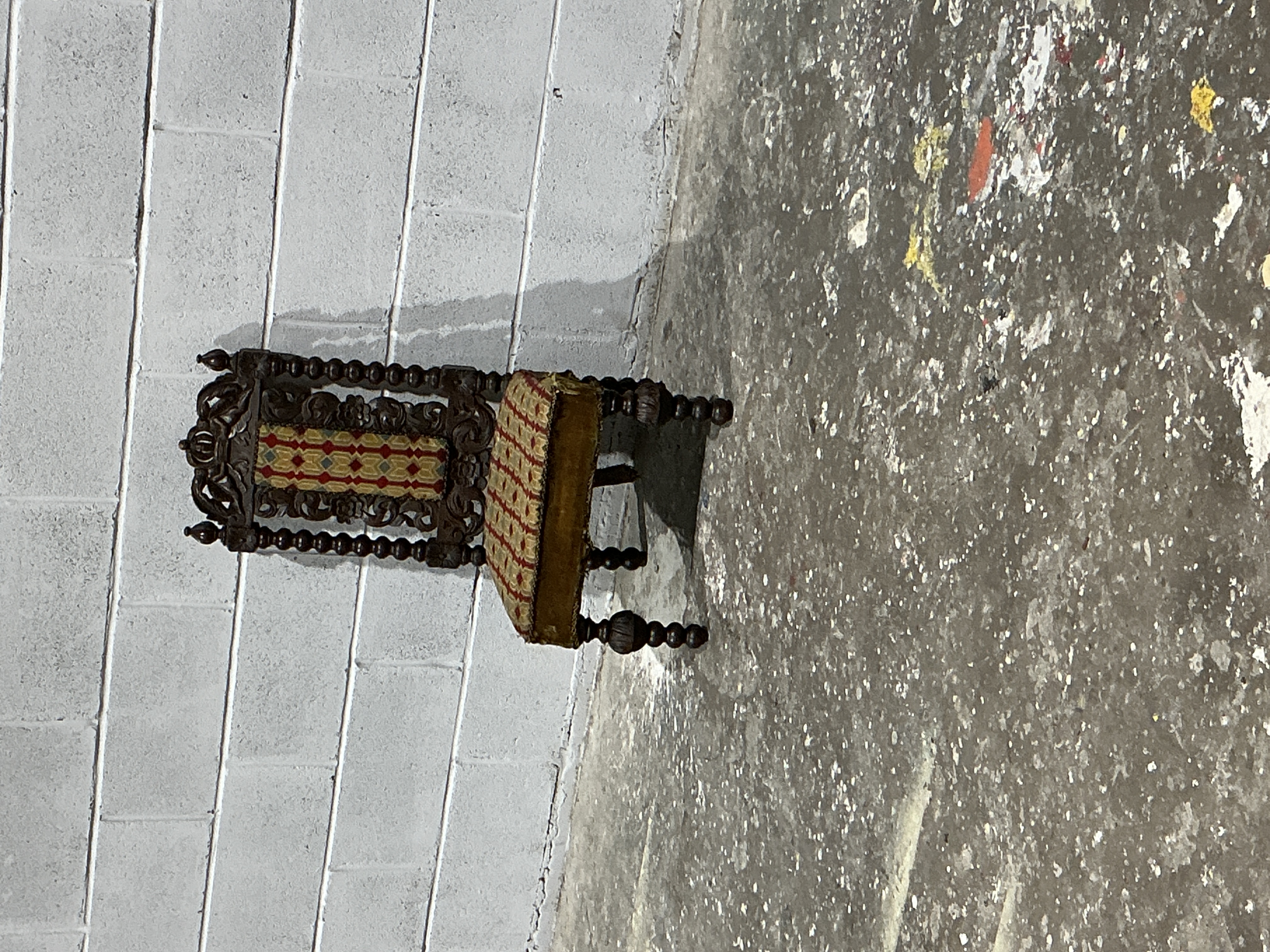 A late 19th-century French Renaissance Revival side chair, also known as Hunt style, featuring a dark-stained wood frame with elaborate bobbin-turned uprights, legs, and H-stretcher. The tall back is designed with a central upholstered panel and an intricate open-work carved crest rail displaying scrolling foliate ornamentation and turned finials. The square seat and back panel are covered in a geometric patterned textile with red, green, and cream motifs.