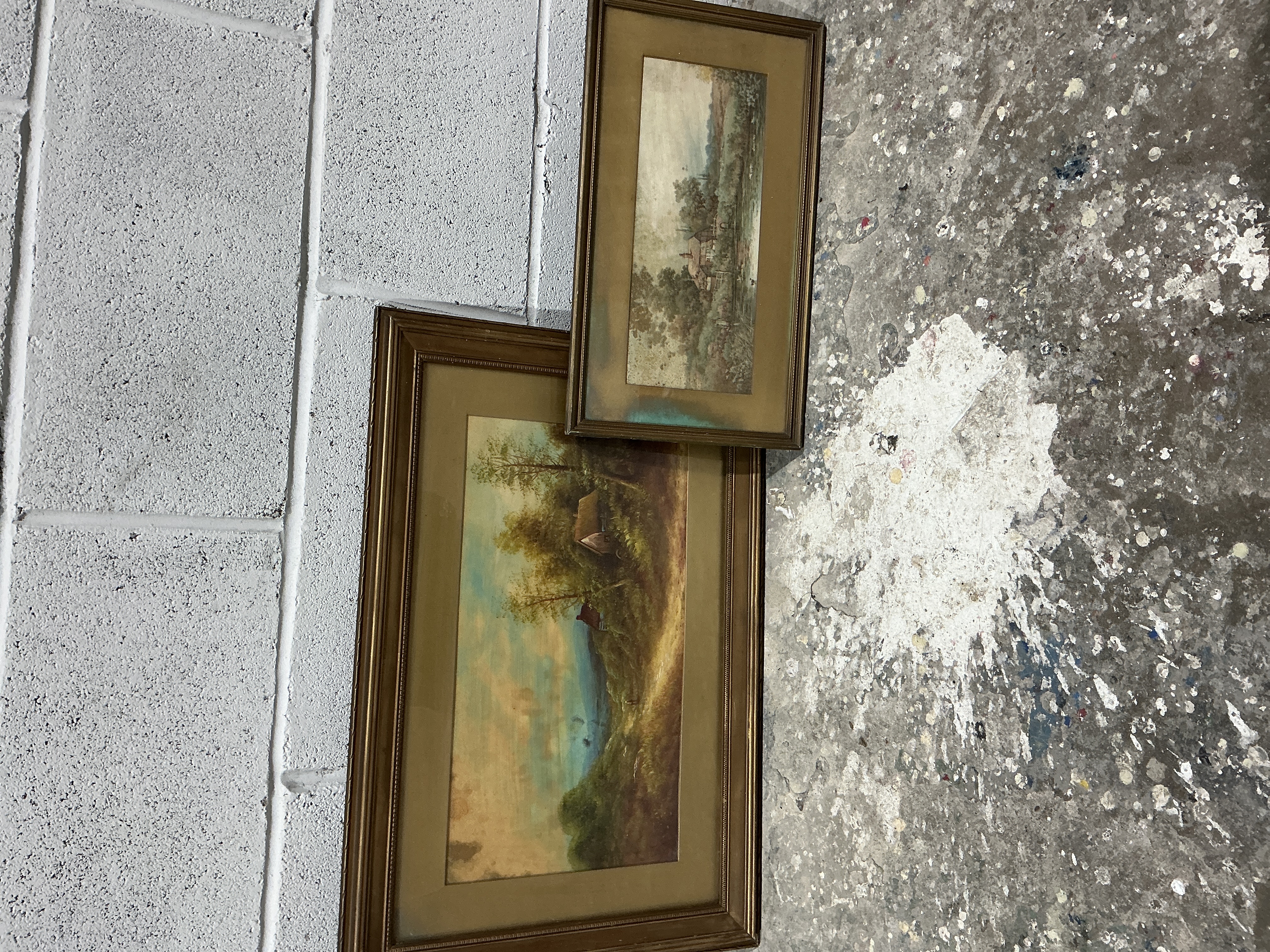A pair of traditional landscape paintings, likely oil on board. The first depicts a pastoral scene with a windmill and cottage by a waterway, executed in a muted colour palette. The second, a larger composition, shows a rustic cottage on a wooded hillside. Both are presented in ornate gilt-finished wooden frames with wide inner mounts. Larger frame 55cm x 35cm, smaller frame 40cm x 25cm.