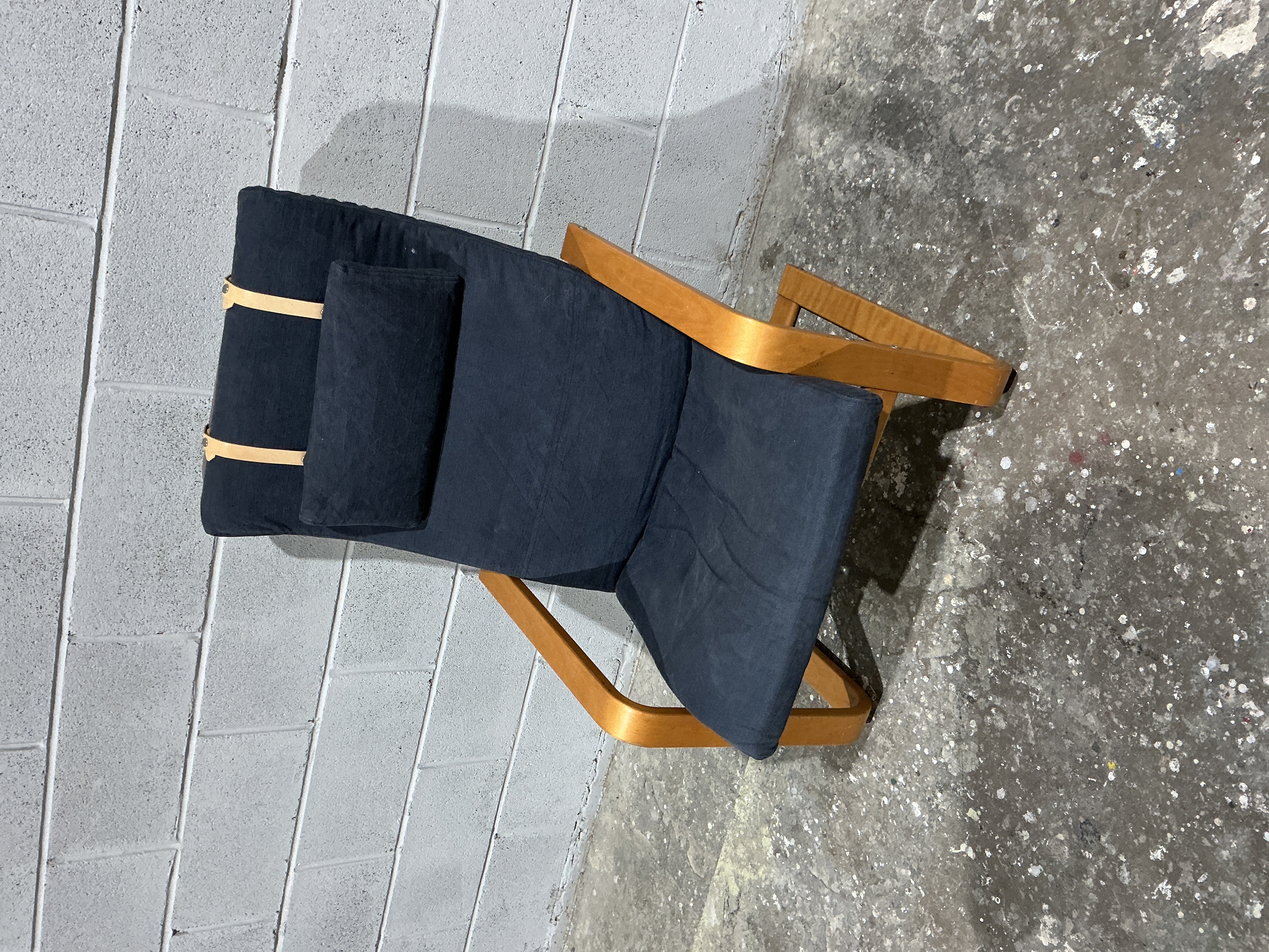 The chair is in good structural condition with the frame remaining sound and flexible. The birch veneer finish is well-maintained with no significant wear or delamination. The navy fabric upholstery is intact but shows minor surface lint consistent with domestic use. The leather straps and metal fasteners are all present and in good order.