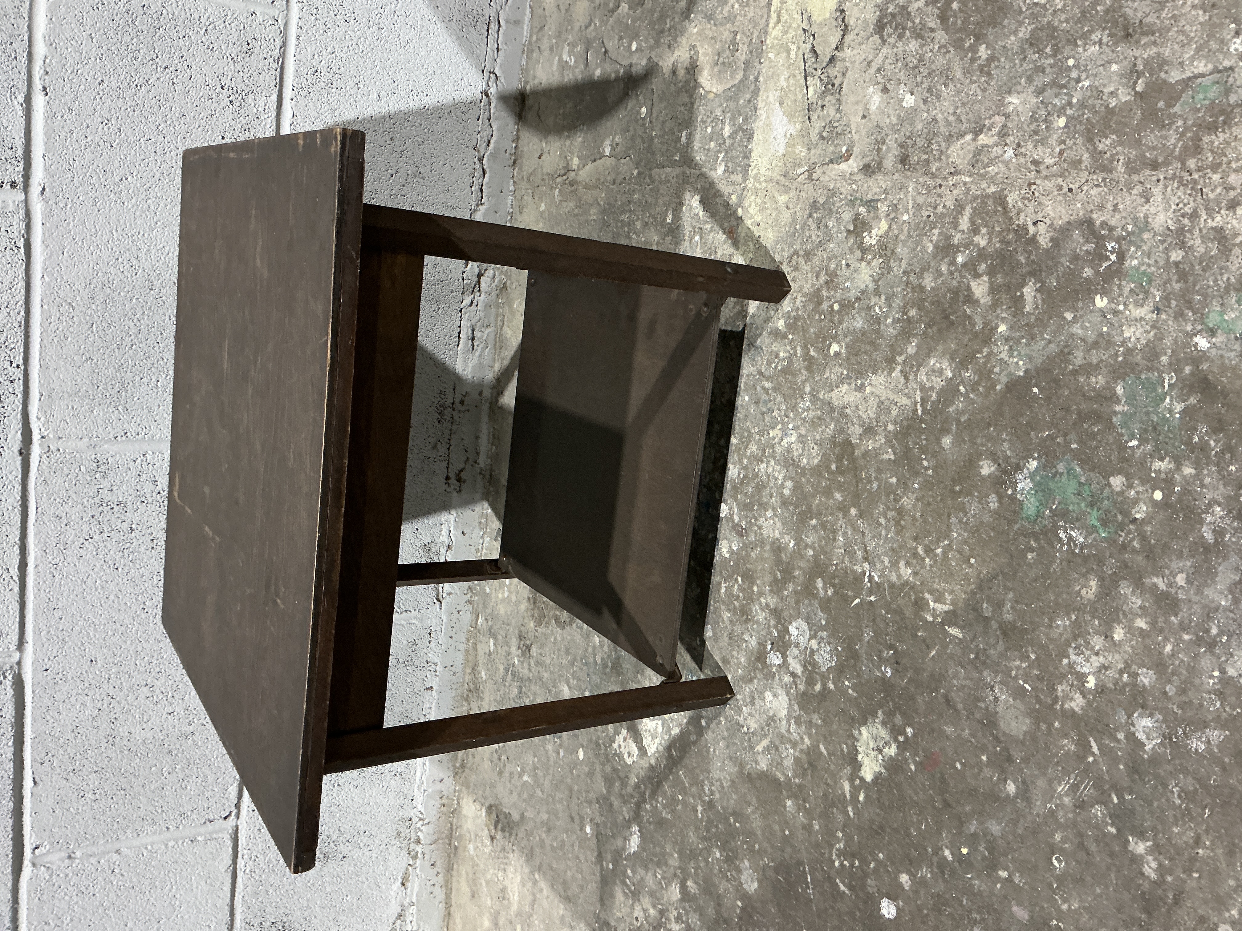 The table is in fair vintage condition. There are visible surface scratches and wear to the finish throughout, consistent with age and utilitarian history. The original paper labels exhibit some losses and wear.