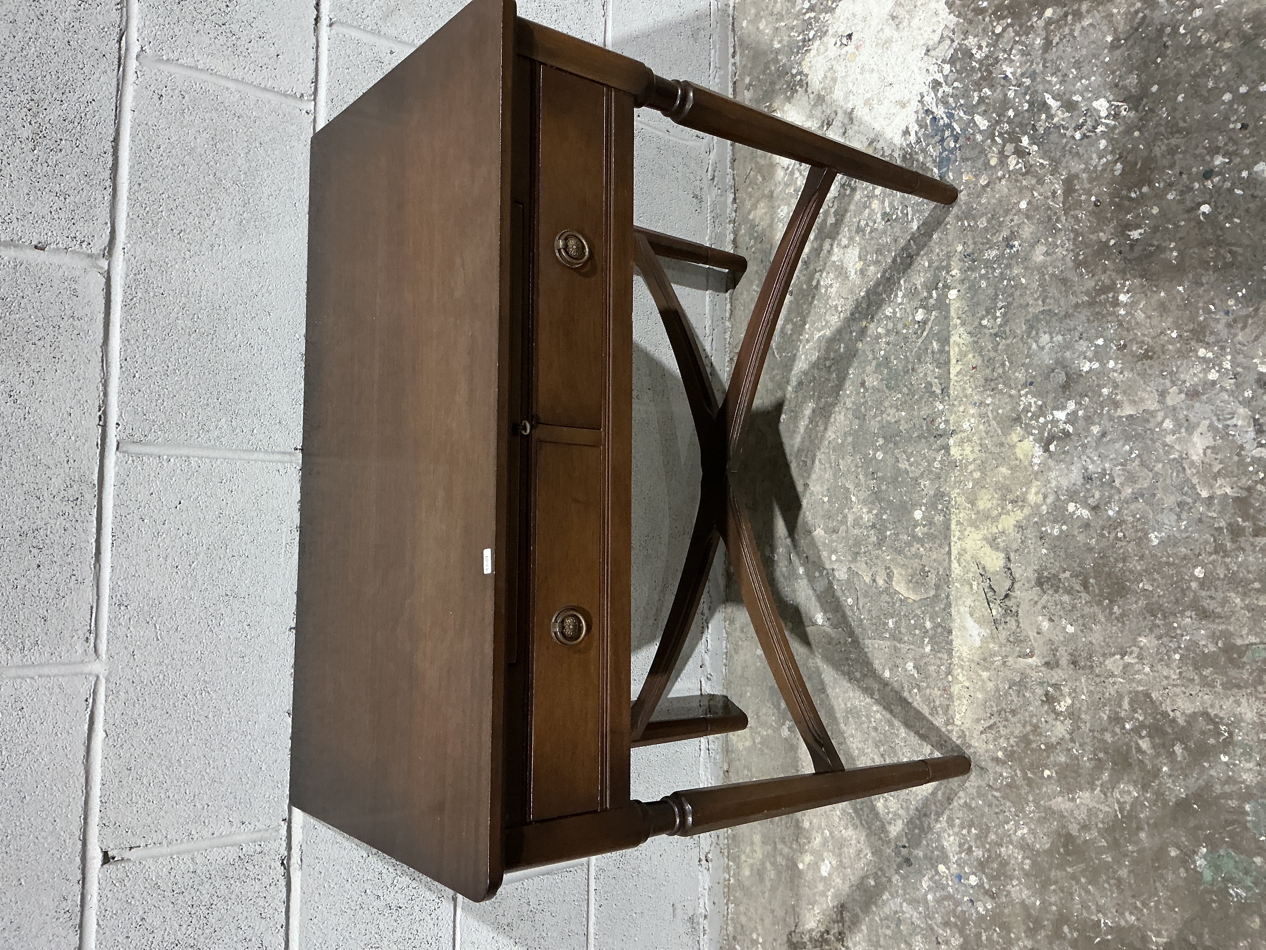 A mid-to-late 20th-century writing desk or side table designed in the Neoclassical revival style, attributed to the British manufacturer Strongbow. The piece is crafted from hardwood with mahogany veneers and a deep mahogany finish, featuring a rectangular top with rounded corners. The frieze contains a single full-width drawer, the front of which is stylised to appear as two separate drawers. Decorative elements include twin brass-toned ring pulls on circular backplates and a central keyhole. The desk is raised on elegant curved X-frame sabre legs with reeded detailing, joined by a central turned stretcher. This form is a refined example of the Directoire revival aesthetic popular in mid-century English cabinet making. 74cm H x 91cm W x 46cm D.
