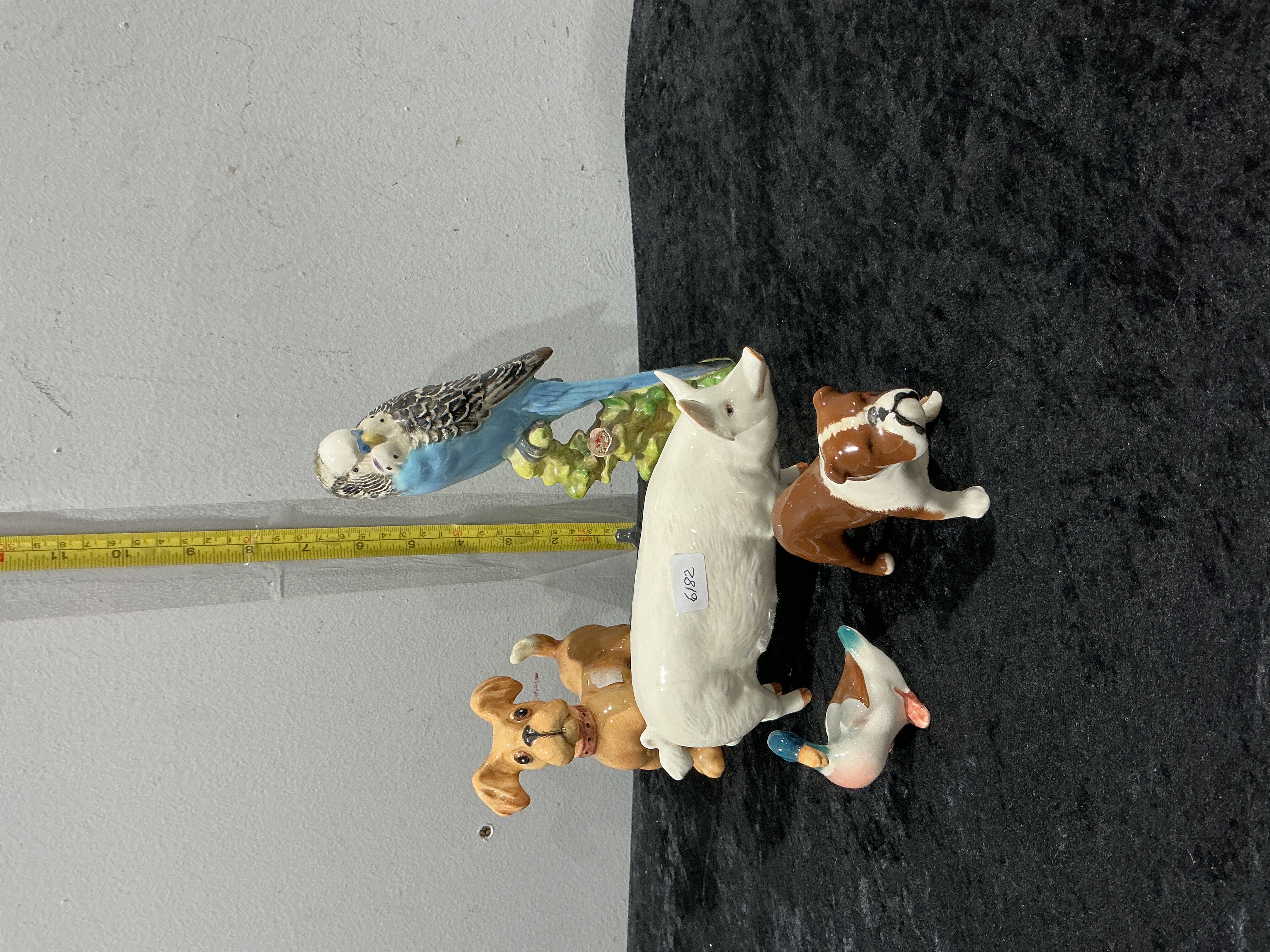 A collection of five glazed ceramic animal figurines manufactured by the English pottery firm Beswick. The lot features a Budgerigar (Model No. 1216) in blue and grey perched on a floral branch, marked Beswick England 1216 Budgie; a Middle White Boar Champion Boy 53rd (Model No. 1453) with green factory backstamp; a seated Bulldog in brown and white glaze with gold-tone foil label and impressed mark; a playful puppy in golden-brown glaze with a red collar, stamped to the paws; and a miniature Mallard duckling marked England. The pig figurine currently bears an auction lot sticker 6182. Height of budgerigar approximately 18cm.