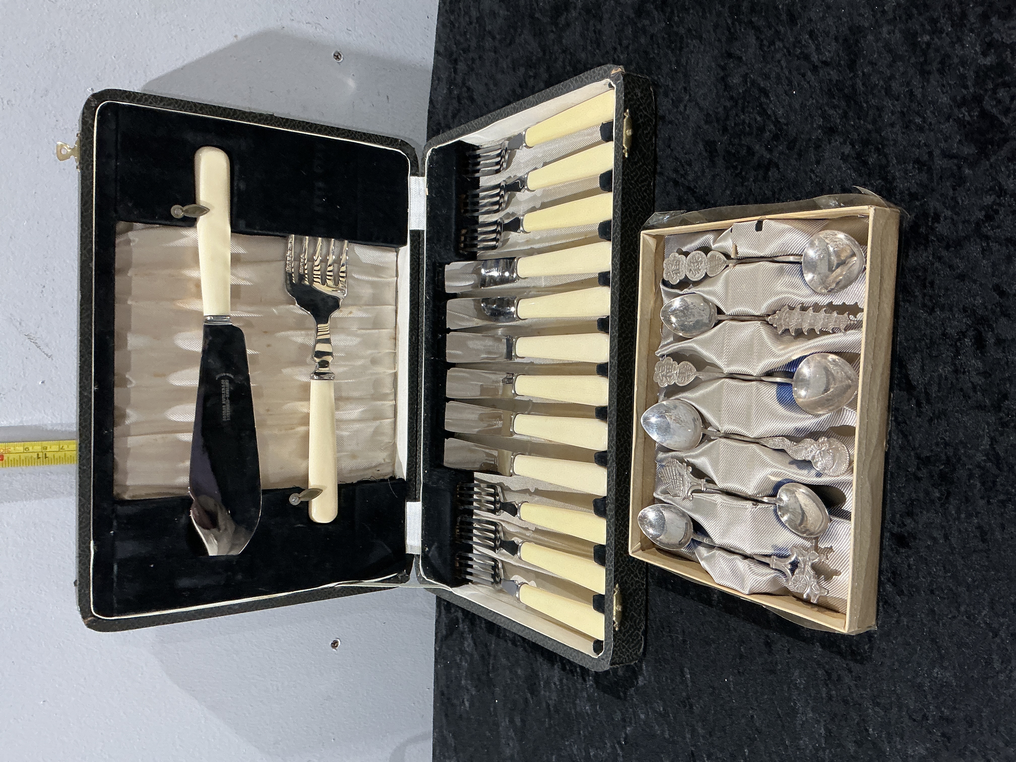 Good vintage condition. The ivorine handles show light, even patina consistent with age. Metal surfaces show minor scratches and light wear. The fish service is housed in a fitted, velvet-lined presentation case with minor exterior shelf wear. The souvenir spoons show surface tarnishing and are presented in a simple satin-lined cardboard box. No monograms present.