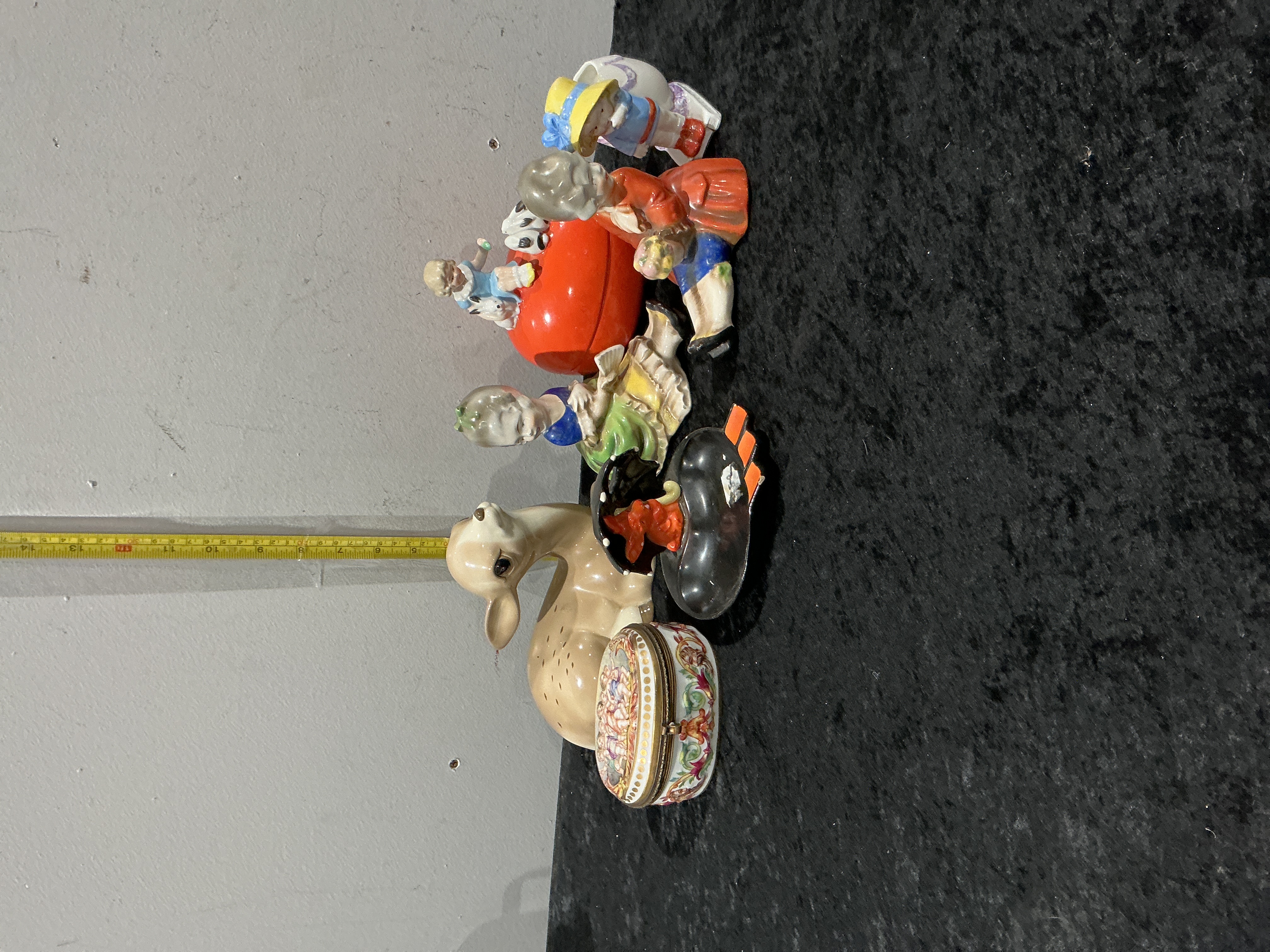 A collection of six decorative ceramic and porcelain items. The lot includes a Thuringian porcelain female figurine by Wallendorf, featuring a green crown factory mark to the base. Also present is a large tan-glazed ceramic reclining deer or fawn, impressed with model number 28/8 and a circular factory stamp. The group is completed by a stylised black and orange bird figurine containing a small red figure within its hollow body, a porcelain group of children on a red sphere marked v75, a small child figurine marked C51, and an oval porcelain trinket box with floral motifs and a hinged metal rim. Height of largest approx. 13cm.