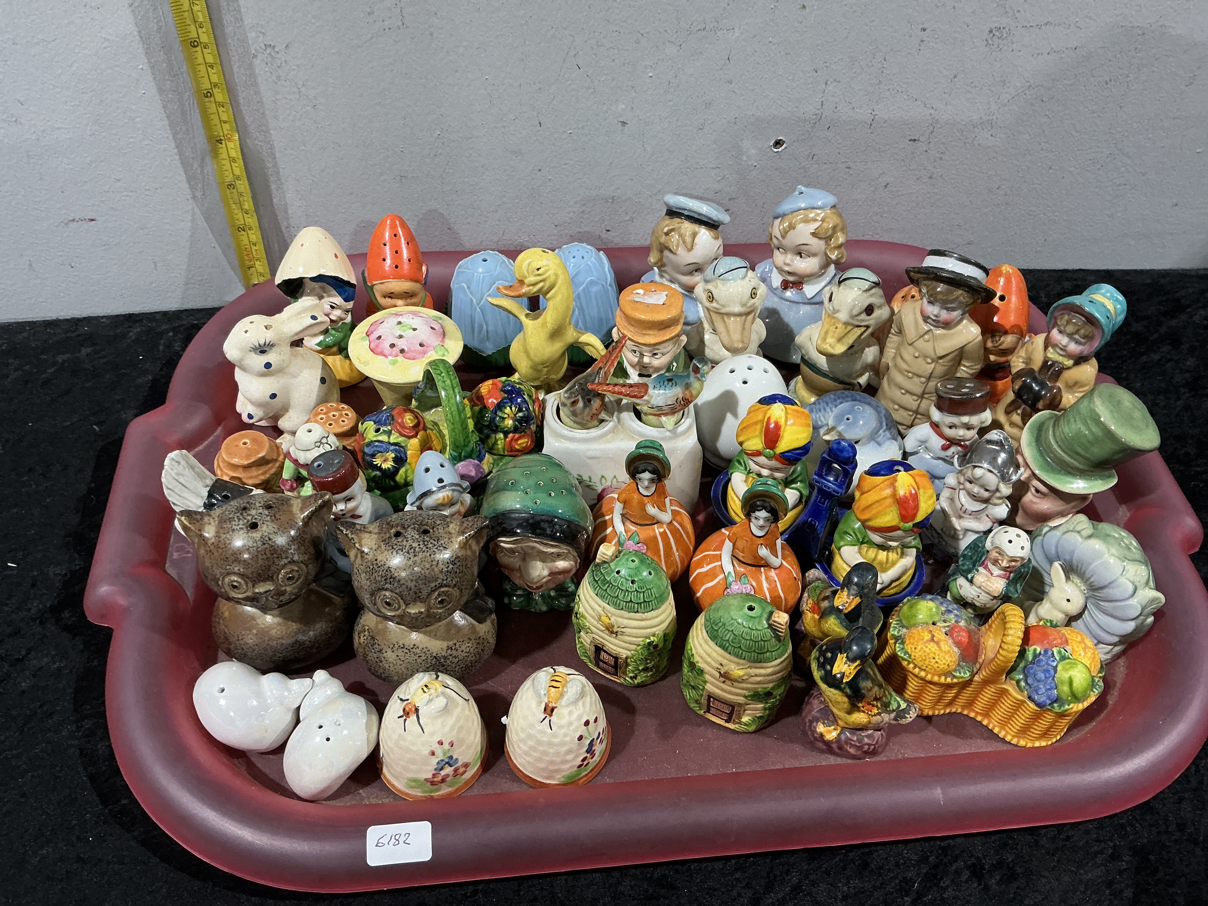 A comprehensive assembly of vintage ceramic novelty salt and pepper shakers, predominantly dating to the mid-20th century. The collection features a variety of moulded earthenware forms decorated with hand-painted glazes, ranging from vibrant high-gloss to textured speckled finishes. The diverse subject matter includes anthropomorphic fauna such as owls, ducks, rabbits, and bees, as well as human figures including children in winter costume, turbanned characters, and figures in Dutch-style dress. Further sets are modelled as beehive skeps, fruit baskets, and floral arrangements. While largely unmarked, the silhouettes and decorative techniques are consistent with mid-century manufacturers such as Shawnee and various Japanese export wares of the period. Tray measures approximately 46cm in width.