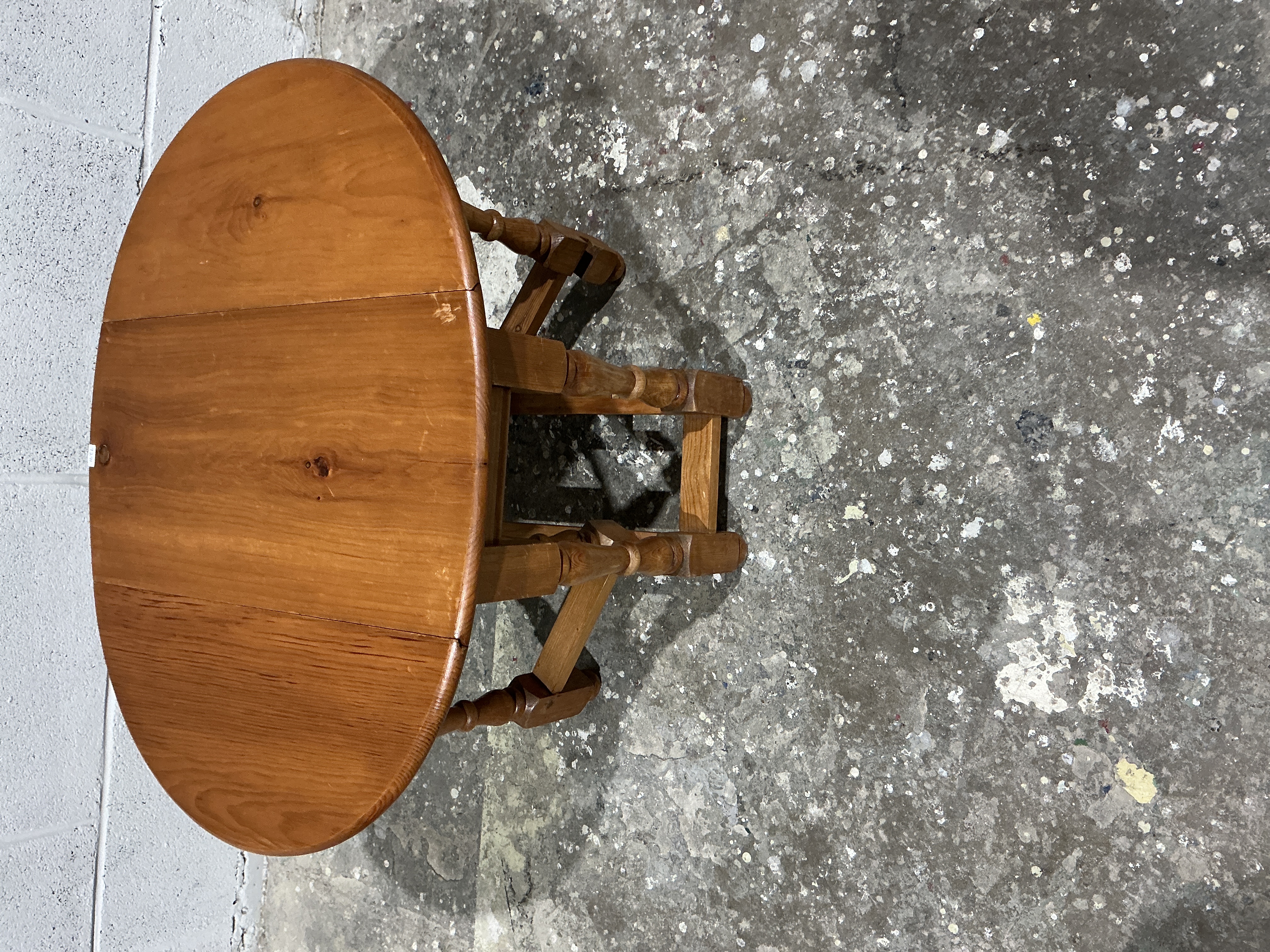A mid-20th century Colonial Revival gateleg drop-leaf table, constructed from solid pine. The piece features a circular three-part top with two hinged leaves that are supported by a gateleg mechanism. The understructure is composed of sturdy turned baluster-form legs connected by square-section stretchers, reflecting a utilitarian farmhouse aesthetic. The wood is finished in a warm honey-toned stain that highlights the natural knots and prominent grain characteristic of pine. This style of furniture was widely produced by American manufacturers such as the H.T. Cushman Manufacturing Company and Ethan Allen during the mid-1900s as part of the Early American revival movement. Dimensions: H 72 cm x W 92 cm x D 92 cm.