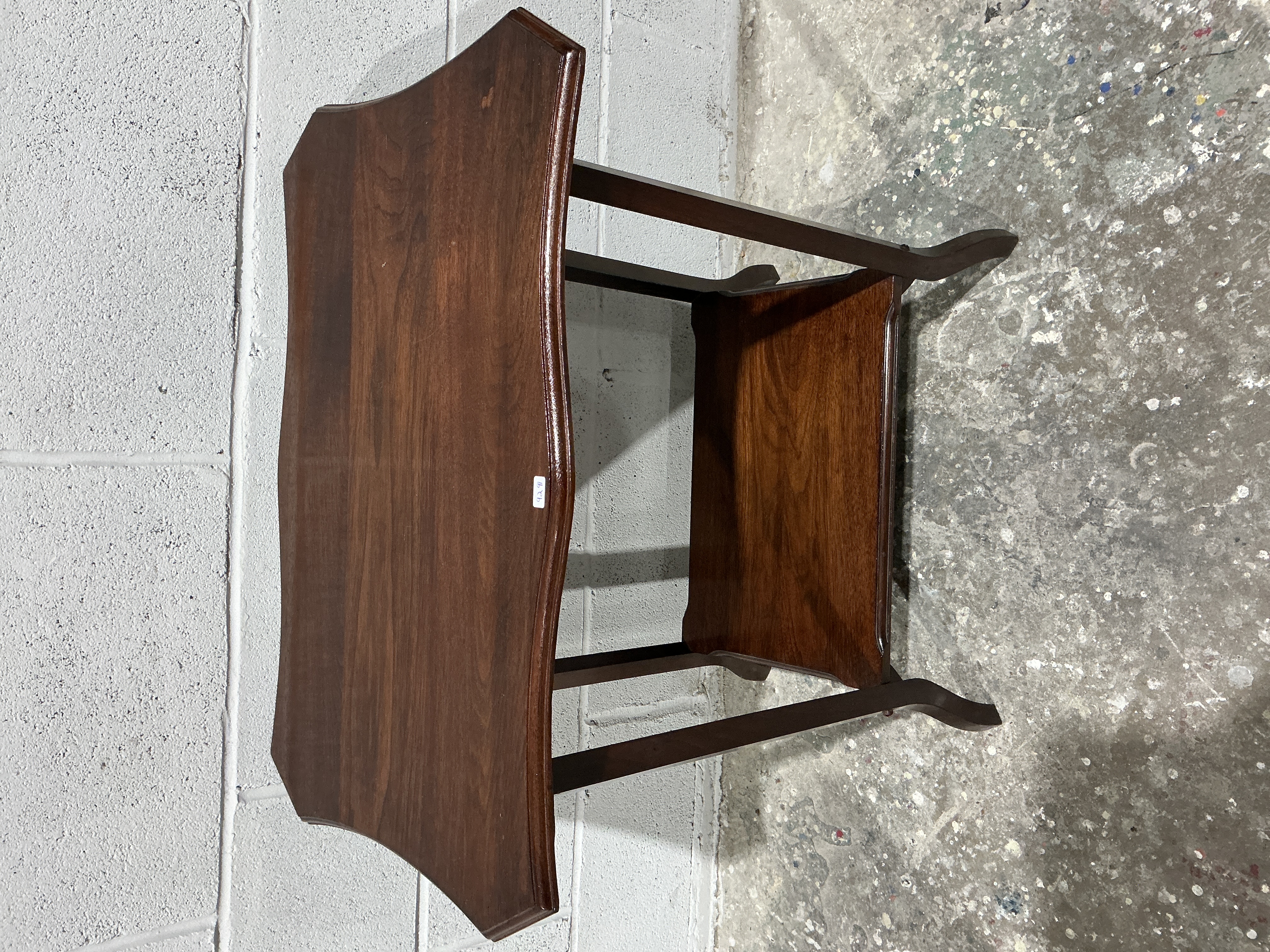 A mid-20th century mahogany side table produced in the Georgian style. The table features a serpentine-contoured tabletop and a matching lower tier shelf. The structure is supported by four square legs terminating in out-turned feet. The piece is constructed from mahogany with a dark-stained finish. A small white inventory sticker is present on the upper surface.