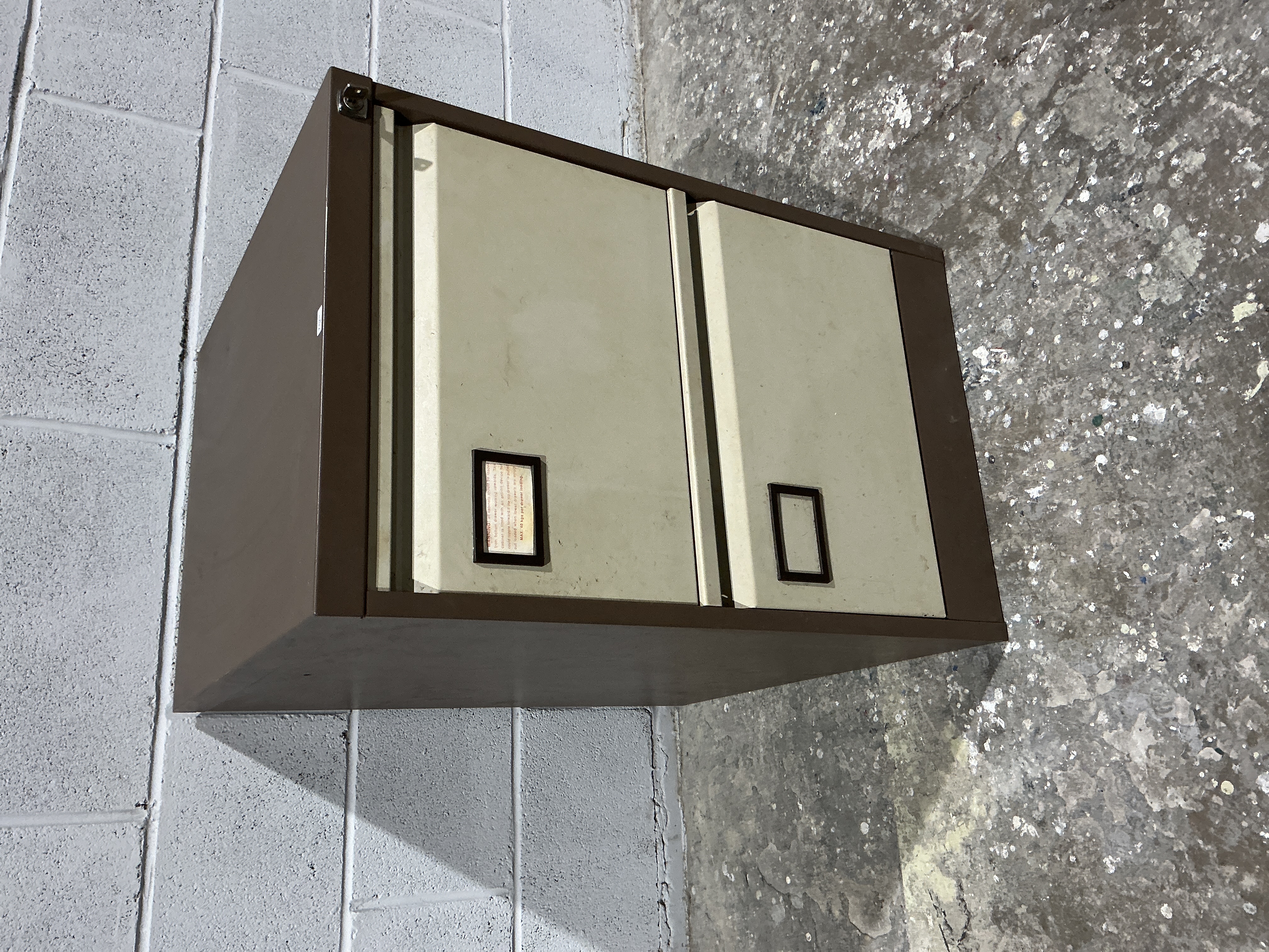 A mid-20th-century industrial vertical filing cabinet attributed to Phoenix Safe Co. The unit features a robust metal construction designed for fire resistance. It is finished in a characteristic two-tone colour scheme, comprising a dark brown outer frame and beige-coloured drawer fronts. Each drawer is fitted with an integrated vertical side pull and a central rectangular label holder; the upper holder retains a printed warning label. A lock cylinder is situated at the upper left corner of the front frame. The utilitarian design reflects the functional aesthetic of mid-century office furniture. Dimensions: approximately 72cm (H) x 47cm (W) x 63cm (D).