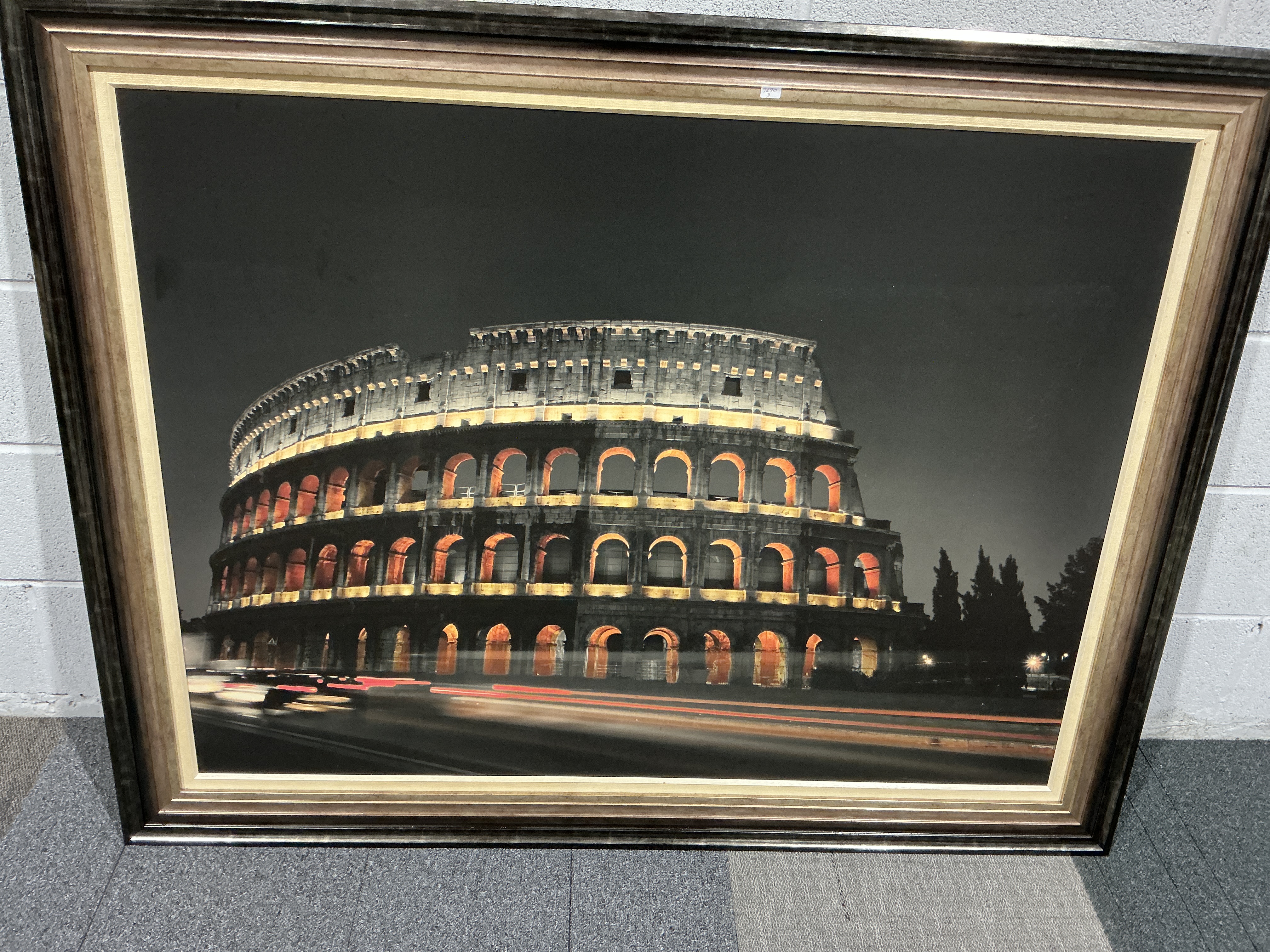 A large-format digital pigment print capturing a night-time view of the Colosseum in Rome. The composition features the illuminated ancient structure against a dark sky, accented by long-exposure light trails from passing traffic in the foreground. The work is presented in a multi-tiered, dark-finished wooden frame with a cream-coloured mat. A gallery label from Sandringham Fine Arts Ltd, Harrogate, is attached to the reverse, bearing the title THE COLOSSEUM, ROME and the reference number W650/915, alongside the Fine Art Trade Guild insignia. This image is a known composition by contemporary photographer Assaf Frank, likely produced as a high-quality commercial gallery print. Dimensions at END.