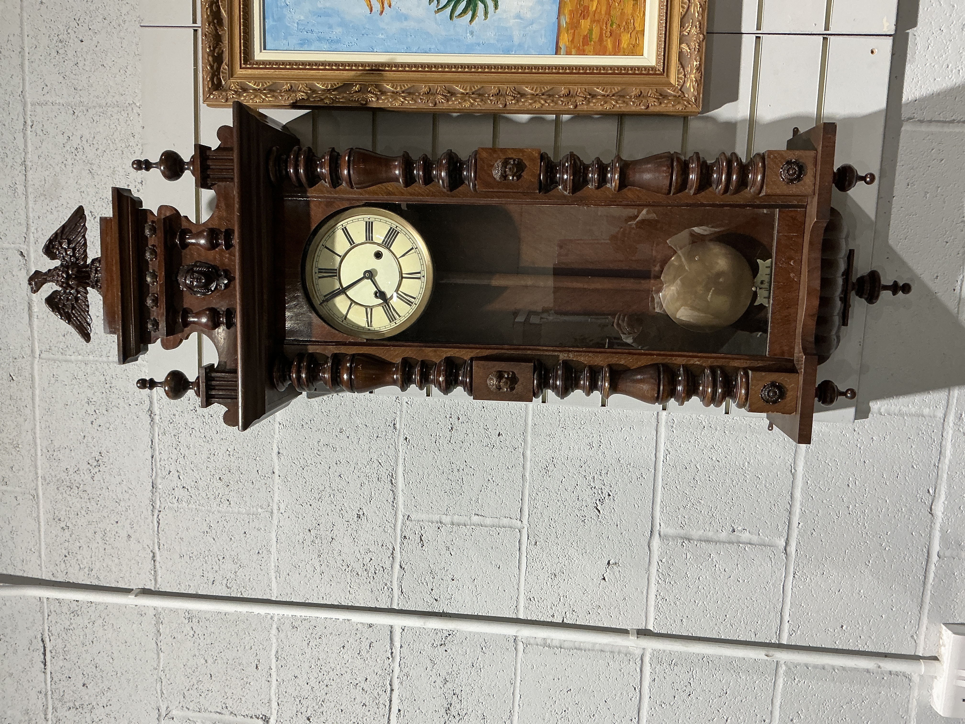 The case is in good aesthetic condition with minor age-related wear to the wood finish and some dust accumulation. All major decorative elements, including the eagle finial and lower drop finials, appear present. The mechanical movement is working order and timekeeping has been overhauled and new bushes etc The dial shows minor age-related discolouration but remains clear. Includes a pendulum. The presence of a winding key is confirmed. Professional servicing has been done on the movement confirmed by customer
