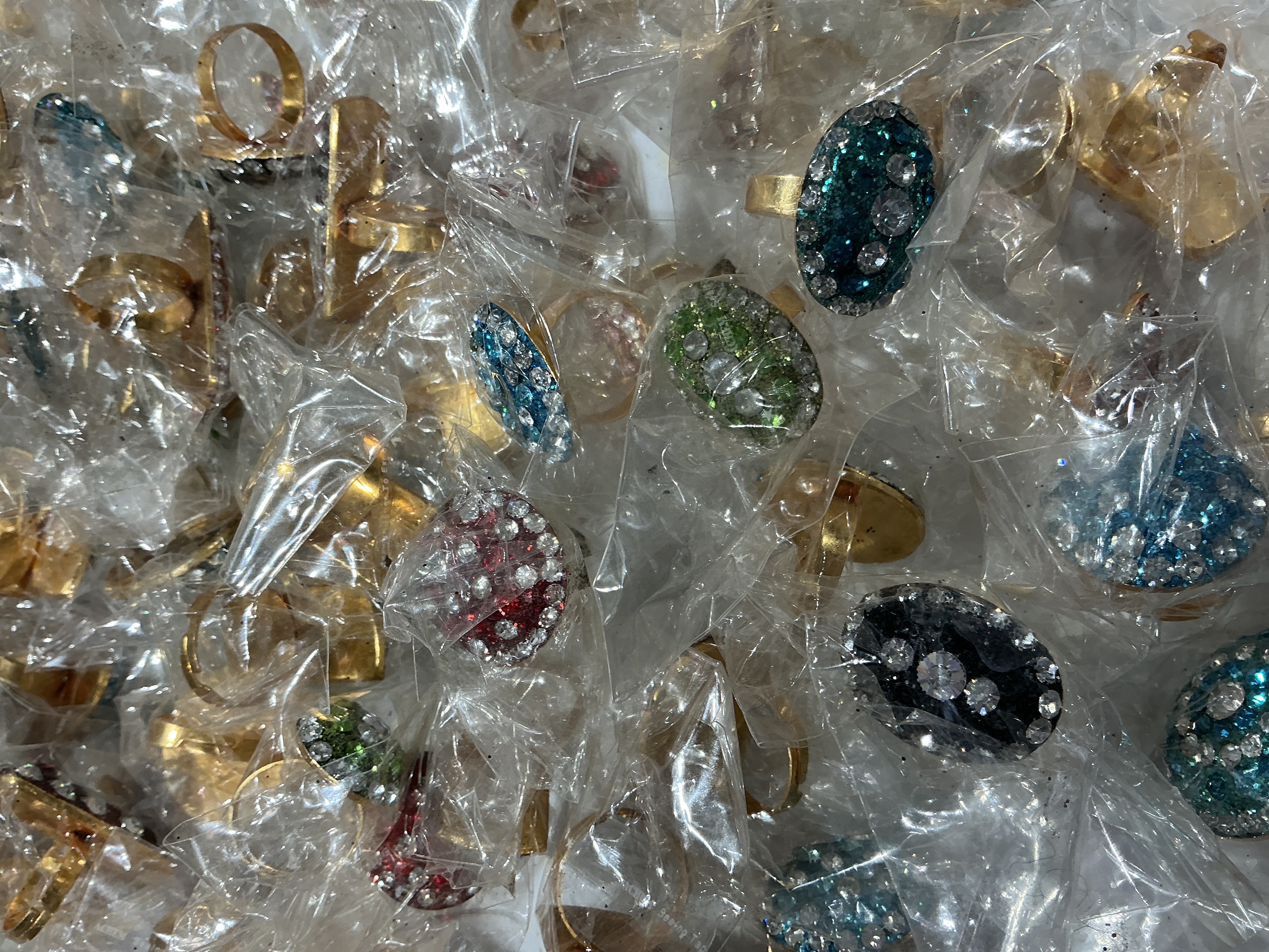 A bulk lot of 100 gold-tone base metal costume jewellery cocktail rings. Each ring features a large oval-faced composite cabochon filled with multi-coloured glitter in shades of teal, green, red, blue, and black. The centre composites are further accented with small, clear faceted rhinestones embedded in the resin. Each piece is set in a simple bezel-style setting on a plain band. There are no visible hallmarks or maker’s marks. Size: Adjustable bands.