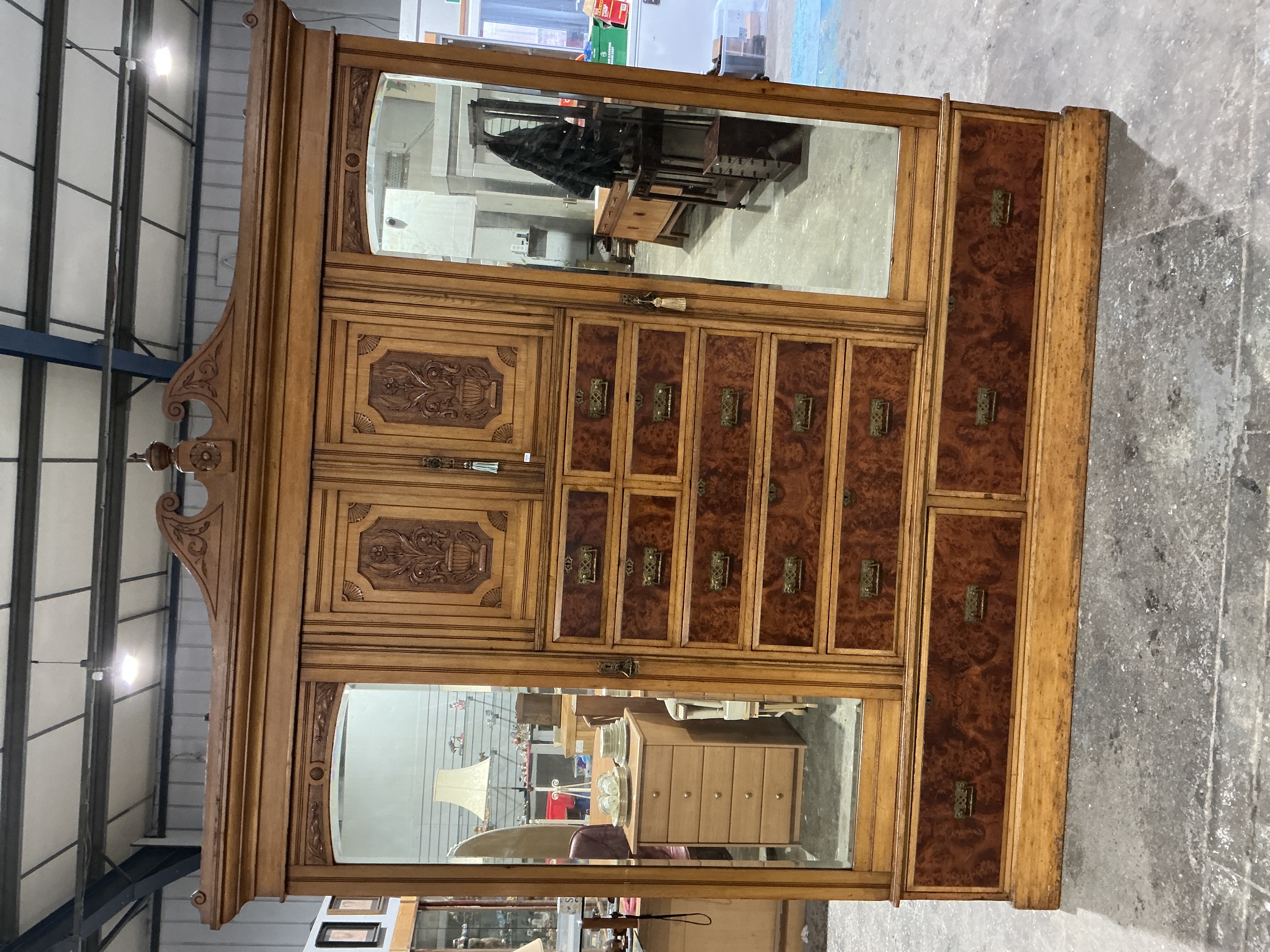 A substantial Late Victorian breakfront compactum wardrobe, circa 1890, expertly constructed from a light-toned oak with striking burr walnut veneer panels to the drawer fronts and cupboard doors. This architectural piece features a central section comprising a twin-door cupboard over a bank of five graduated drawers. The cupboard doors are intricately carved with recessed panels depicting foliate scrolls and classical urn motifs. This central unit is flanked by two full-length bevelled mirror doors which open to reveal generous hanging space, alongside further side drawer units. The entire structure is surmounted by a decorative swan-neck pediment with a central turned and carved finial. The wardrobe is fitted with its original ornate brass hardware, including decorative escutcheons and drop handles. The piece reflects the Renaissance Revival influence of the late 19th century, designed for both aesthetic impact and functional utility. Dimensions: H 238cm x W 215cm x D 62cm.