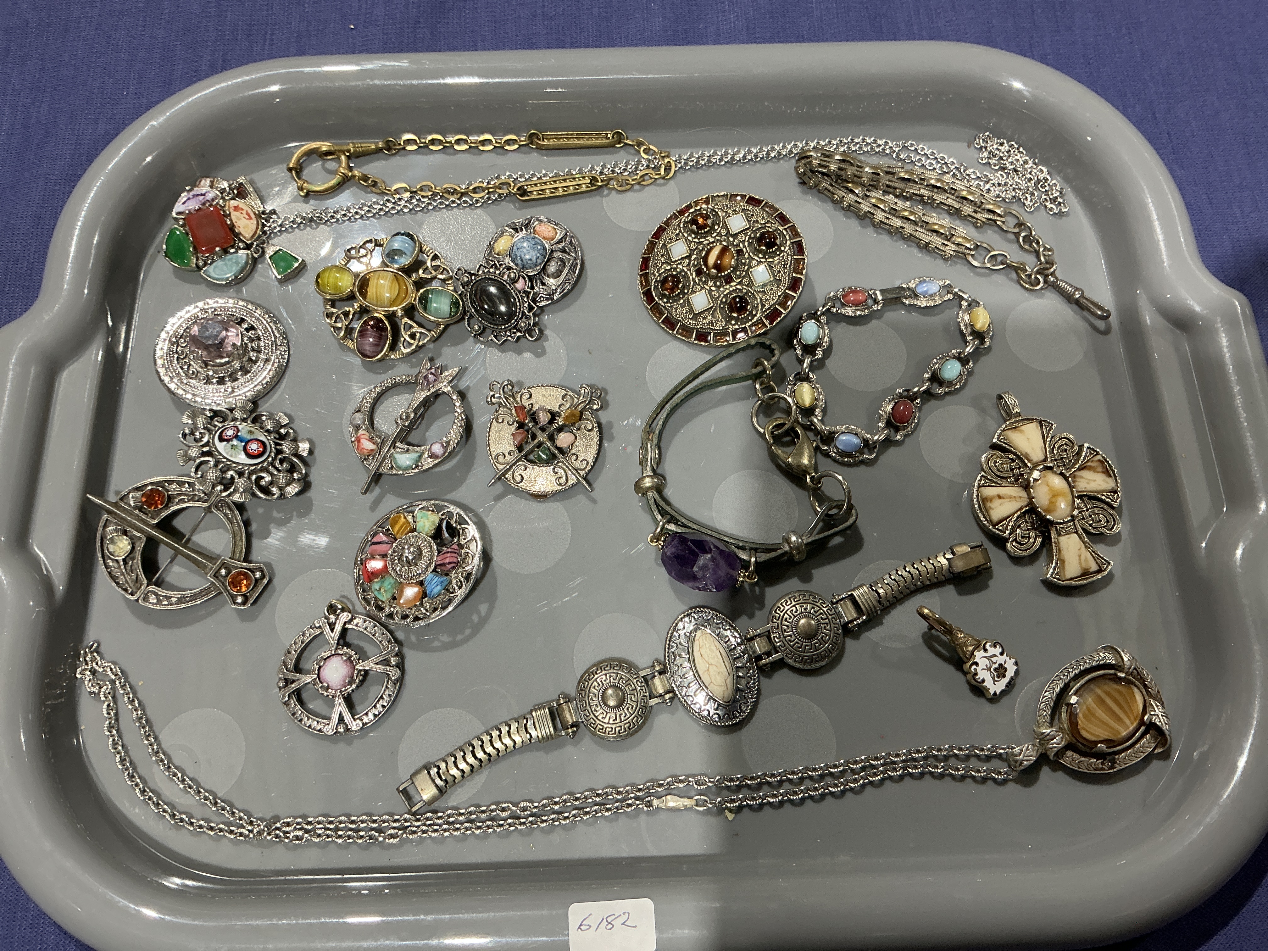 A collection of silver-toned and gold-toned Scottish Revival costume jewellery including Miracle style brooches and pendants