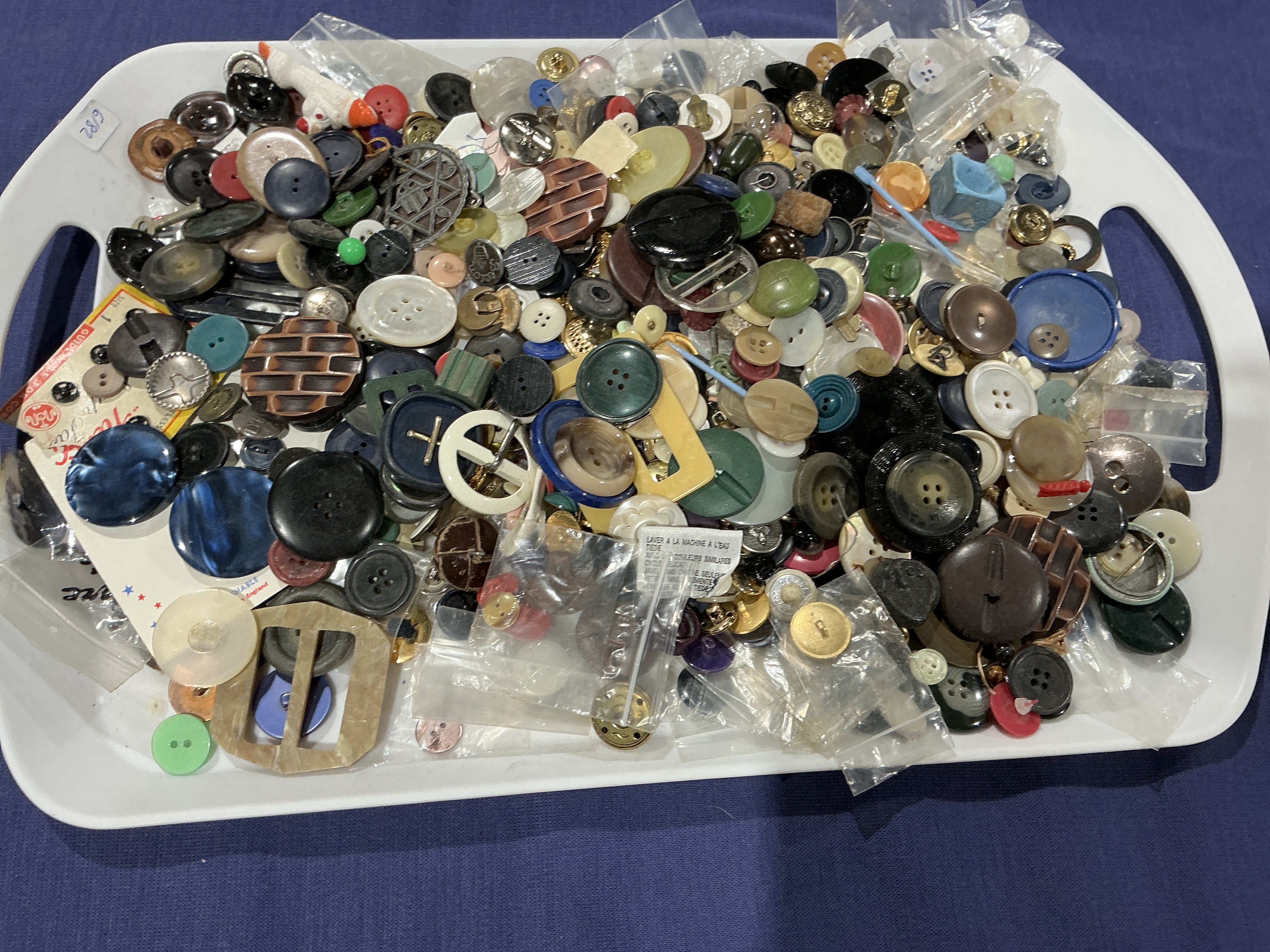 This lot comprises a comprehensive and diverse collection of buttons and buckles. Brand: Various, including Le Chic. Model: N/A. Reference number: N/A. Movement type and caliber: N/A. Case material: N/A. Dial: N/A. Bracelet: N/A. Serial number: N/A. Box and papers: Includes some buttons on original retail cards. The collection includes hundreds of loose buttons in various sizes, colours, and materials such as mother-of-pearl, wood, metal, and plastic. Styles range from utilitarian to decorative and vintage pieces. The lot is presented in a large white plastic tray and includes items grouped in small plastic zip-top bags. Case size: N/A.