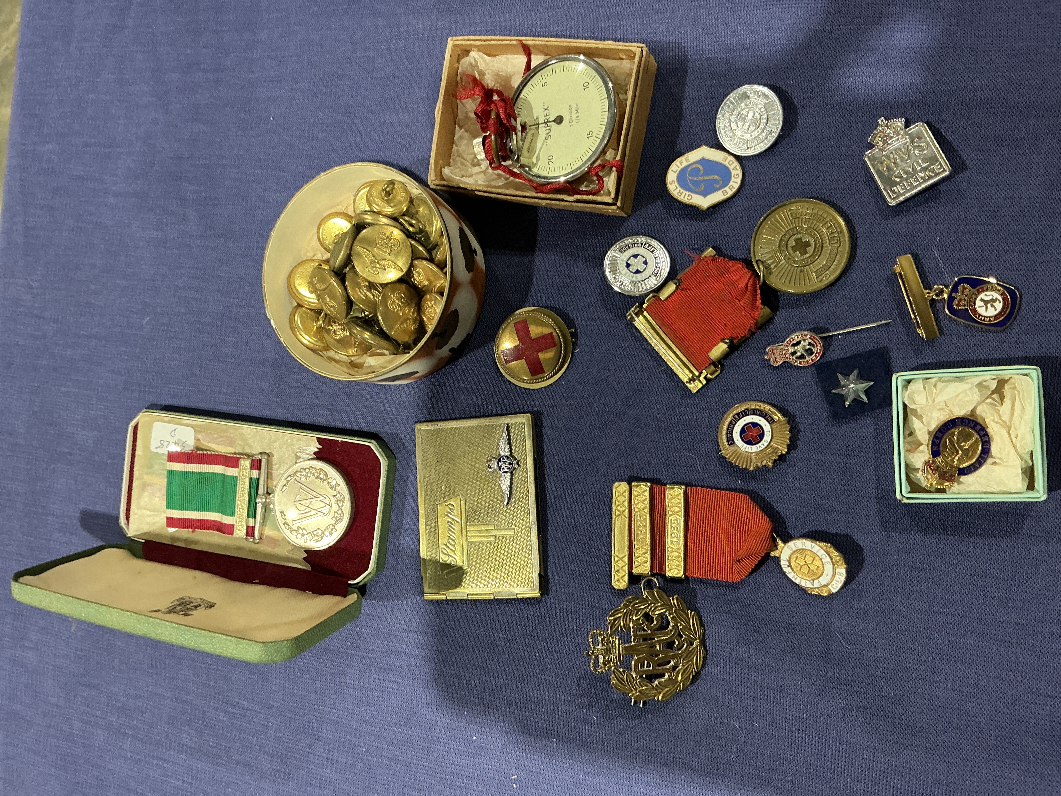 This lot comprises a diverse collection of British mid-20th-century service medals, insignia, and personal accoutrements, primarily focusing on Home Front organisations and the Royal Air Force (RAF) during the Second World War and the immediate post-war period. The collection includes a Women’s Voluntary Service (WVS) Long Service Medal in its original green presentation case, featuring the stylized WVS monogram and the original red, white, and green ribbon. Also present are two British Red Cross Society (BRCS) awards: a For Merit Medal featuring three dated bars for 1935, 1936, and 1937 with a white enamel Service cross, and a large gilt Proficiency Medal. Insignia includes a variety of Girls’ Life Brigade (GLB) enamel badges, a silver-toned WVS Civil Defence badge, and a boxed Civil Defence Corps enamel badge. The RAF is represented by a large gilt brass wreathed eagle cap badge and a significant quantity of brass uniform buttons. Personal equipment includes a boxed Suprex mechanical map measurer (opisometer) and a gold-toned sweetheart-style stamp case with an applied miniature RAF wings insignia. These items represent the varied contributions of both civilian volunteers and military personnel during the mid-century era.
