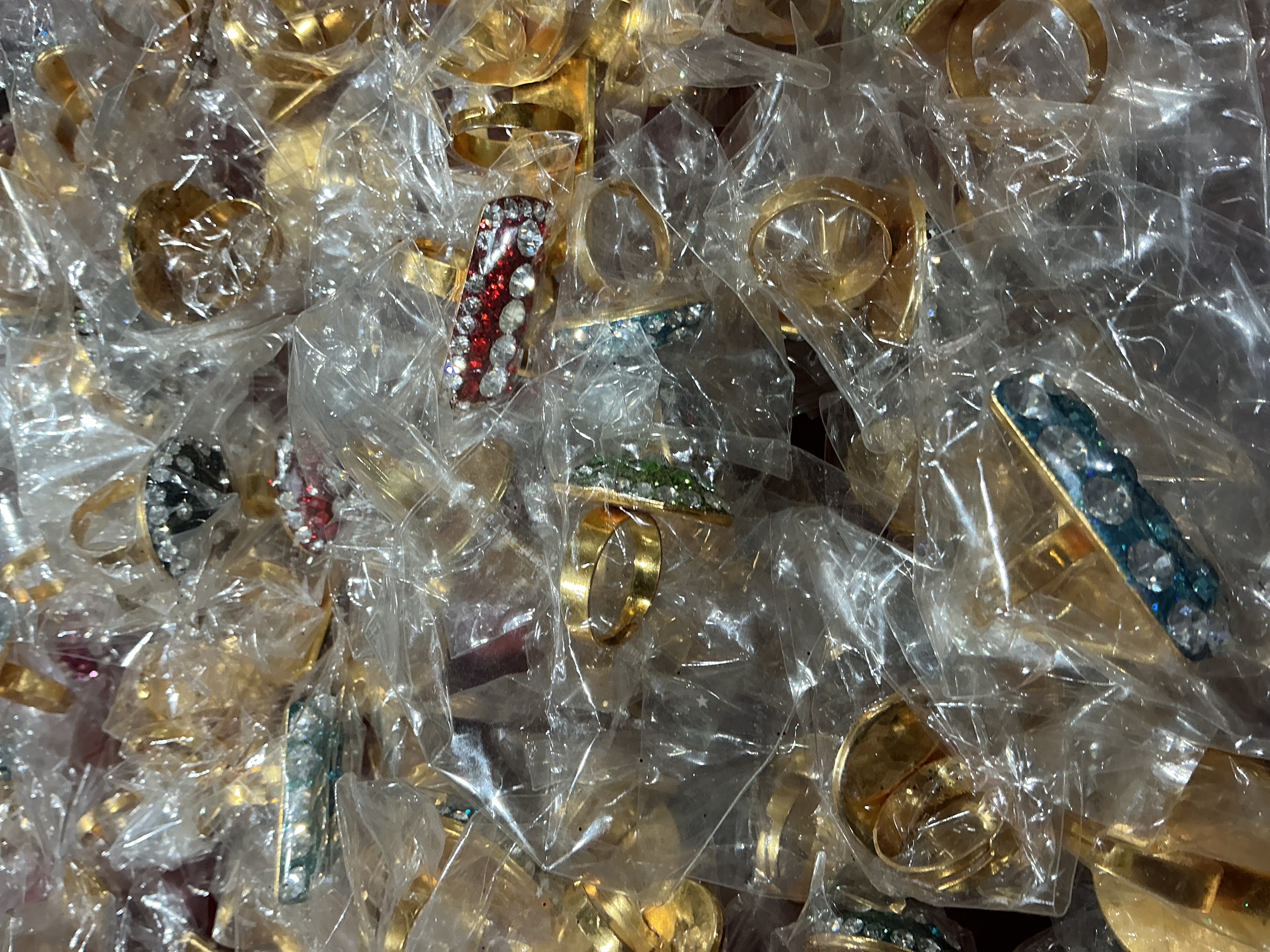 Gold-tone base metal, lot of 100 costume cocktail rings, multi-coloured synthetic stones