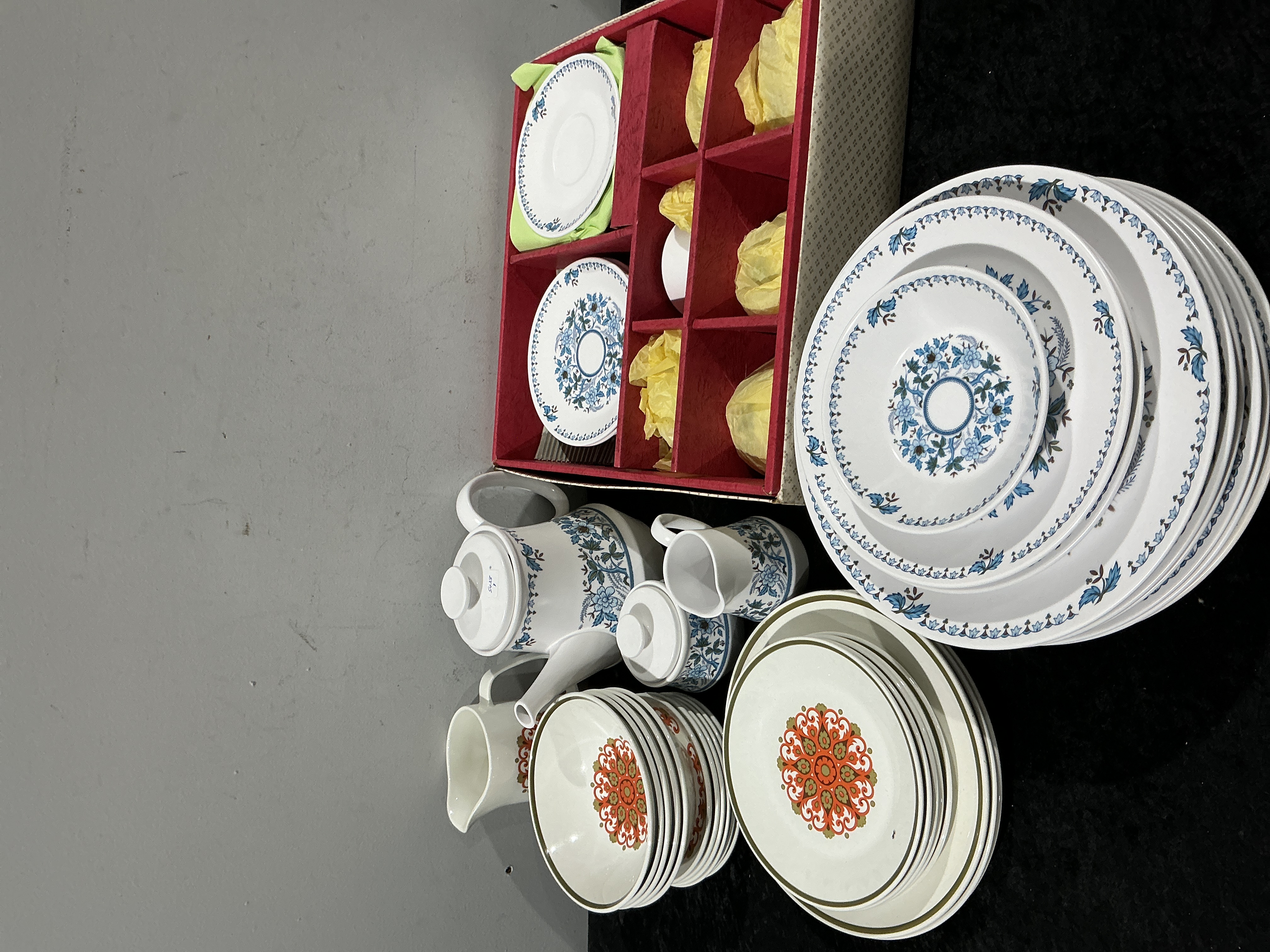 A comprehensive collection of vintage Japanese ceramic tableware by Noritake, primarily featuring the Blue Moon pattern (9022) from the Progression line, circa 1970s. The Progression series was noted for its durable, heat-resistant stoneware body designed for oven-to-table use. The Blue Moon pieces are decorated with a delicate blue floral and foliate border on a white ground and include a lidded teapot, a lidded sugar bowl, two creamers, and an assortment of plates and saucers, some housed in a red-lined presentation box. Also included is a secondary group of stoneware featuring a central stylised sunburst or mandala motif in orange, brown, and green tones with a green rim line, comprising plates and bowls. This collection exemplifies the Mid-Century Modern aesthetic of the late 20th century. Dimensions unrecorded.