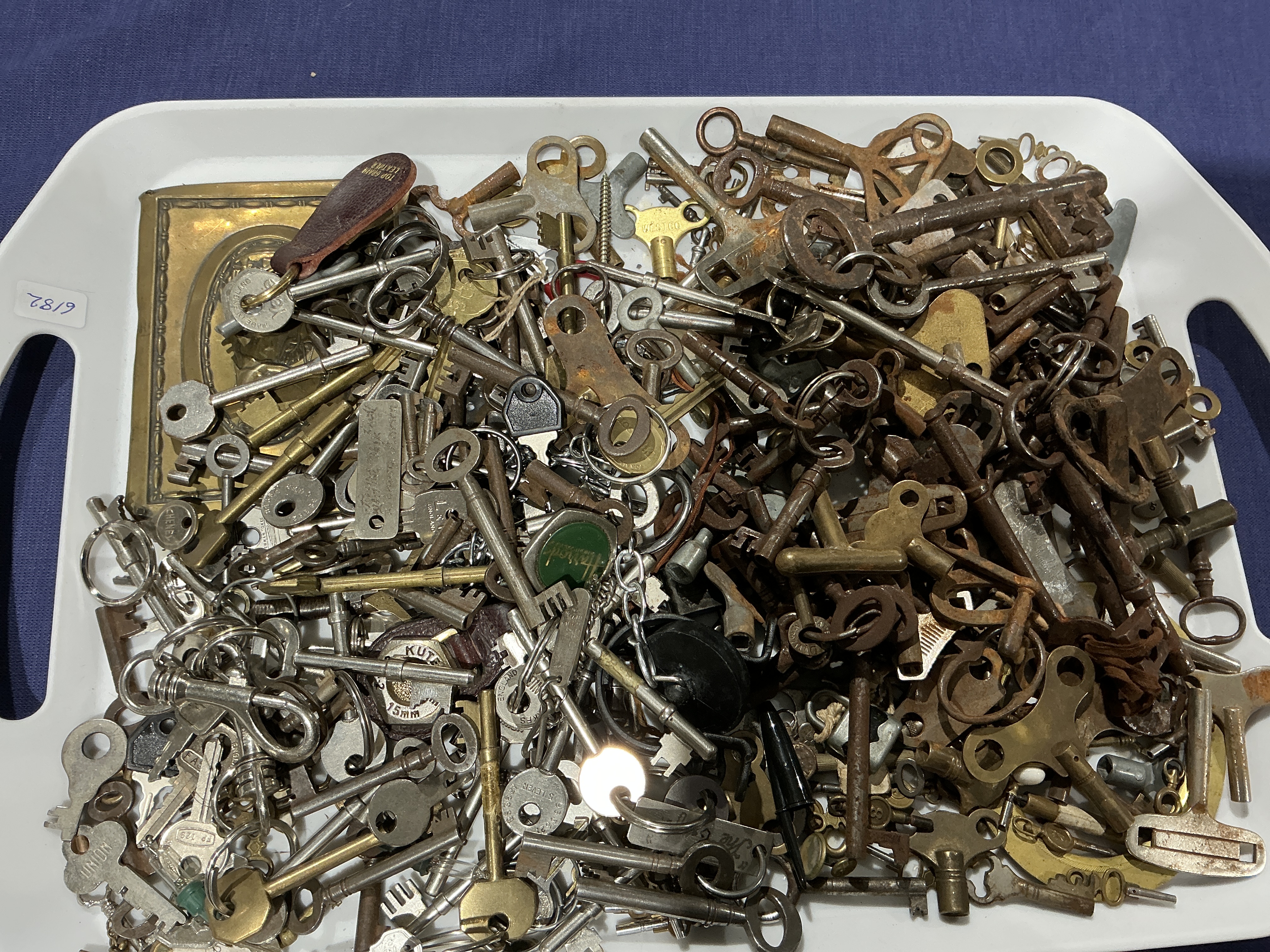 A comprehensive collection of antique and vintage keys and associated metalware. The assortment features a variety of forms including skeleton keys, barrel keys, flat door keys, and several clock-winding keys, as well as a brass plaque and leather fobs. The materials comprise a mix of base metals including yellow brass, silver-toned steel, nickel, and oxidised iron. Notable inscriptions and maker’s marks include UNION, WESTCO, and MADE IN ENGLAND, with a leather fob stamped TOP GRAIN LEATHER. This lot represents a diverse range of historical security and horological winding tools. Weight and measurements are not provided.