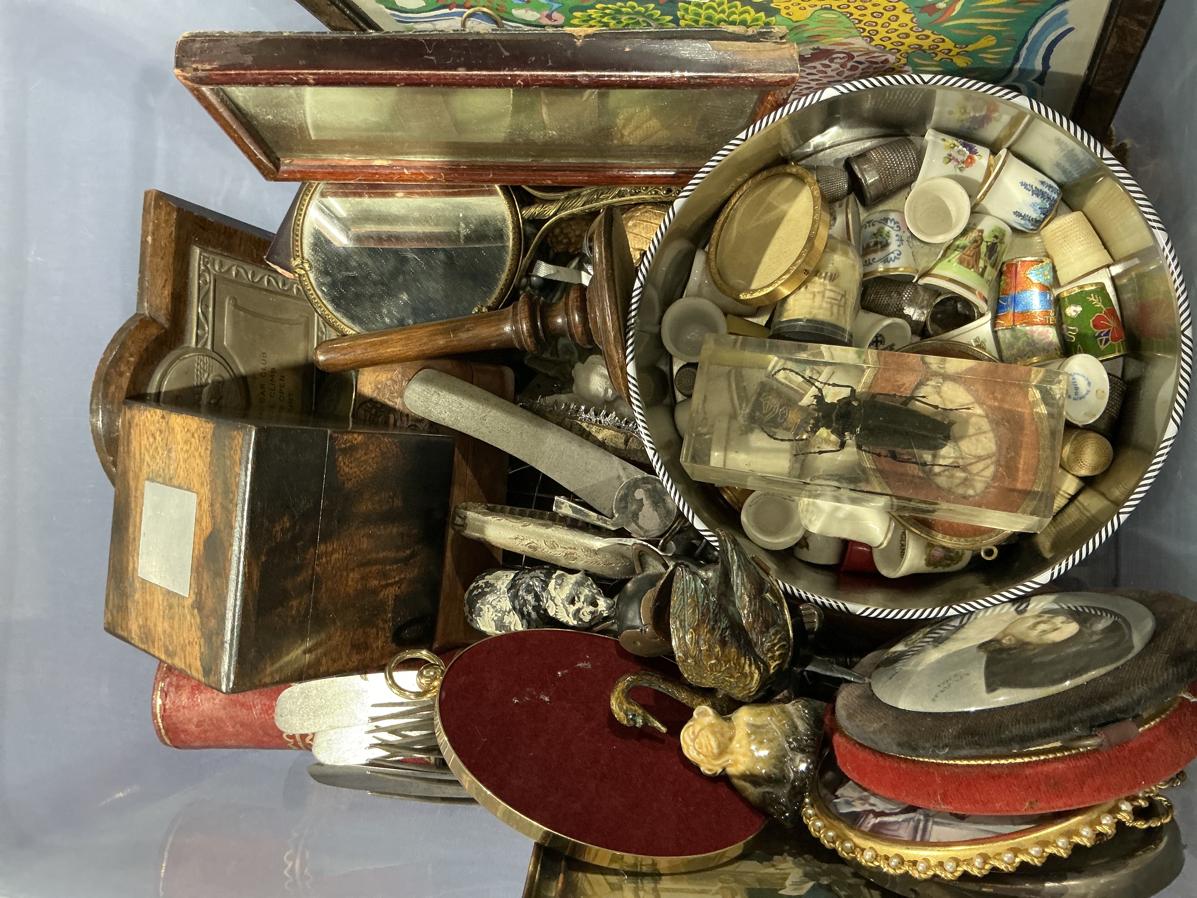 A diverse assortment of vintage decorative items . The collection includes a circular yellow gold-toned frame delicately set with small white seed pearls, alongside several small portrait miniatures housed in various frames. Notable curiosities include a large quantity of porcelain and metal thimbles contained within a round tin, a resin block encasing an insect specimen, and a red velvet-covered circular display piece with a gold-toned rim. The lot further comprises wooden boxes, mirrors, a silver-toned fork, and a small ceramic dog figurine. Materials present include yellow gold-toned and silver-toned base metals, fabric, glass, and wood.