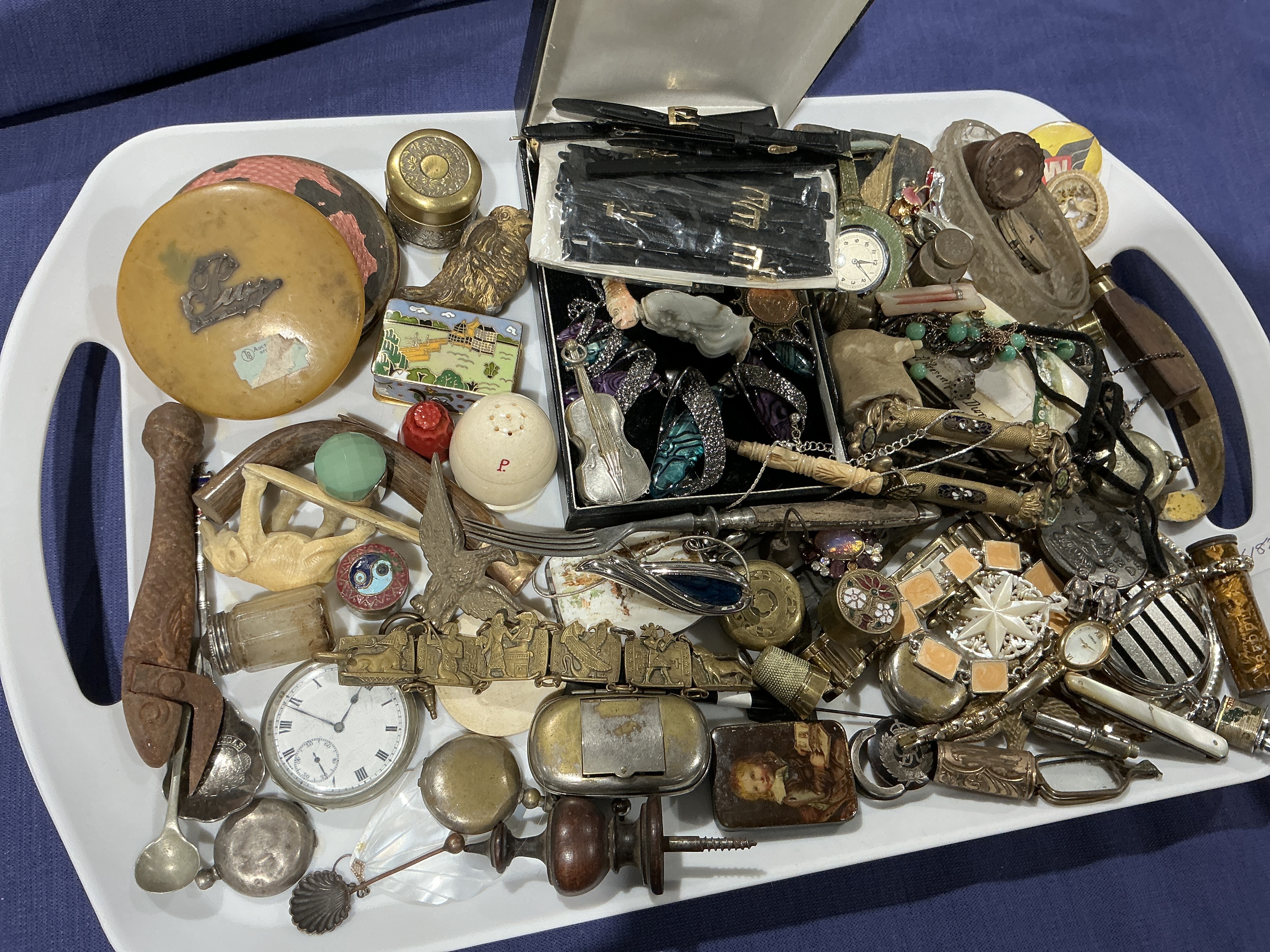 A diverse assortment of antique and vintage collectables featuring a variety of timepieces, jewellery, and personal effects. The lot includes several pocket watches with Roman numeral faces and multiple wristwatches, accompanied by a boxed set of black leather replacement straps. Notable jewellery pieces comprise a brass Egyptian Revival style link bracelet with figurative panels, a star-shaped brooch, various enamelled brooches, necklaces, pins, and a silver-toned violin pin. Decorative items include an enamelled landscape trinket box, a round yellow composite box marked Lugo, a ceramic salt shaker marked with a red P, a thimble, and several small carved figurines including an eagle and a small animal. The collection also features a heavily oxidised iron hand tool and various small hardware components. Materials represented include brass, silver and gold-toned base metals, wood, glass, and leather. No measurement scale present.