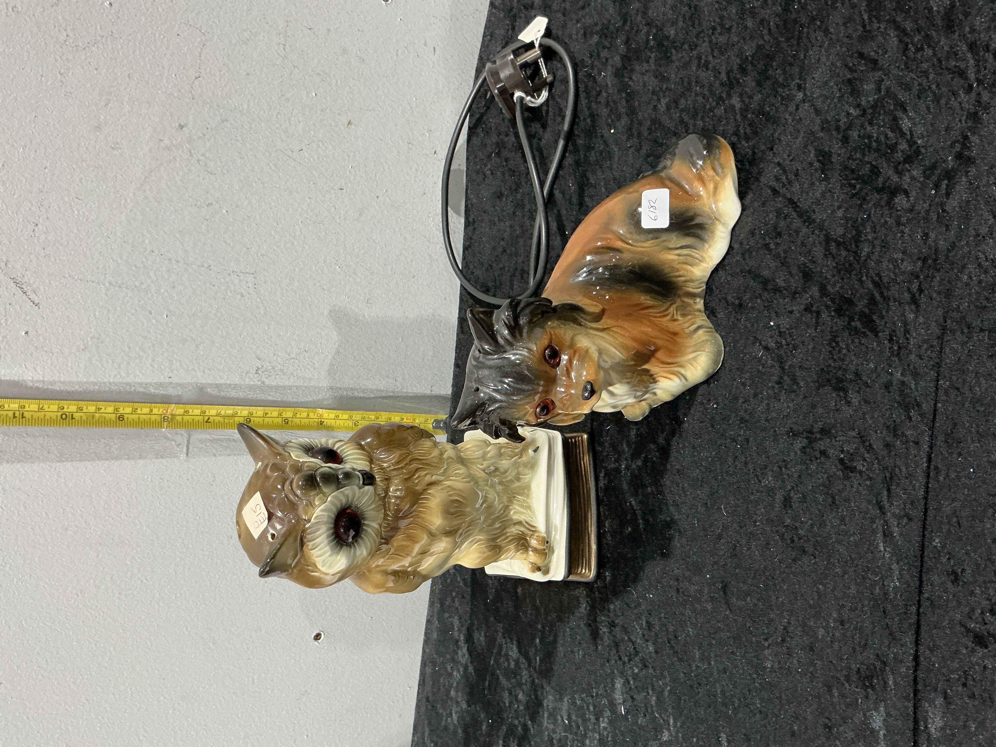 Both items are in good vintage condition with no apparent chips, cracks, or restorations. Surface wear and dust are present consistent with age. The dog lamp retains its original electrical fittings; however, the electrical status is untested and rewiring is recommended for safety. The owl figurine is missing its electrical fittings.
