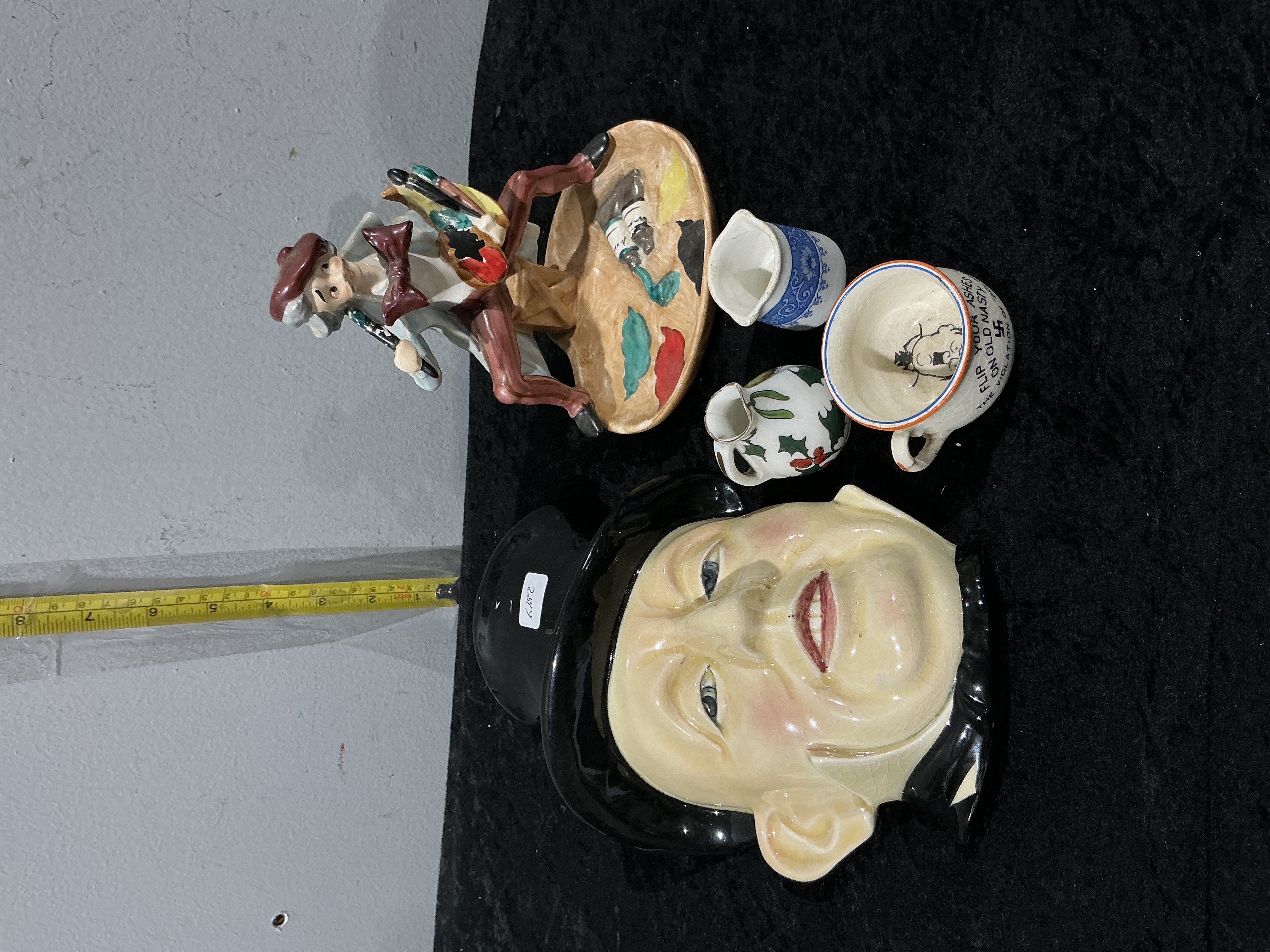 This assorted collection of mid-20th-century ceramic and porcelain wares features a prominent French Sarreguemines majolica wall mask. The mask depicts a characterful man in a black top hat with a high-gloss glaze and moulded details, typical of the factory’s grotesque and character series. Also included is a hand-painted figurine of an artist seated upon a palette-shaped base, alongside two miniature creamers—one decorated with blue transfer-printed scrolls and the other with a hand-painted holly and berry motif. Of particular historical interest is a WWII-era novelty porcelain cup or ashtray, featuring an orange-painted rim and an interior caricature with the anti-Nazi slogan Flip your ashes on old nasty. The collection represents a mix of European decorative styles and mid-century novelty items. Wall mask measures approximately 20 cm in height.