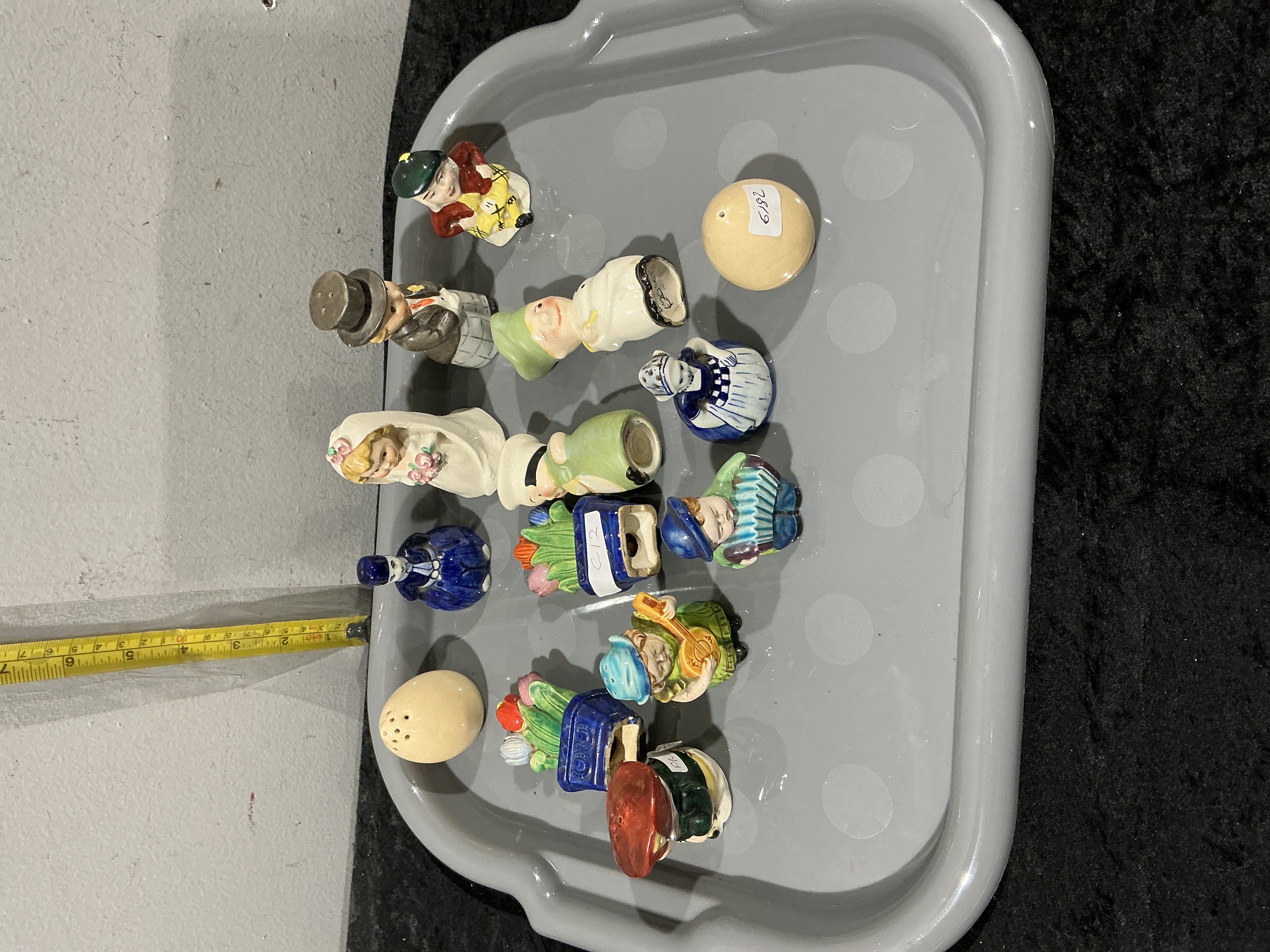 A diverse assortment of approximately 14 vintage ceramic items, primarily consisting of salt and pepper shaker pairs and individual figurines. The collection features a variety of folk and whimsical themes, including Dutch-style figures in traditional regional dress with clogs and bonnets, a wedding-themed pair featuring a groom in a top hat and a bride in a veil, and figures in Scottish-style kilts. Also included are floral motifs featuring tulips in blue planters, a figure playing a lute or guitar, a baker or chef figure, and two plain, spherical cream-coloured shakers. The items are constructed from a mix of glazed and matte-finished ceramic and porcelain. No prominent manufacturer factory marks or decorator signatures are visible on the exposed undersides. Some pieces carry handwritten lot or inventory markers, including C 12 and 6182. Height approximately 4cm to 10cm.