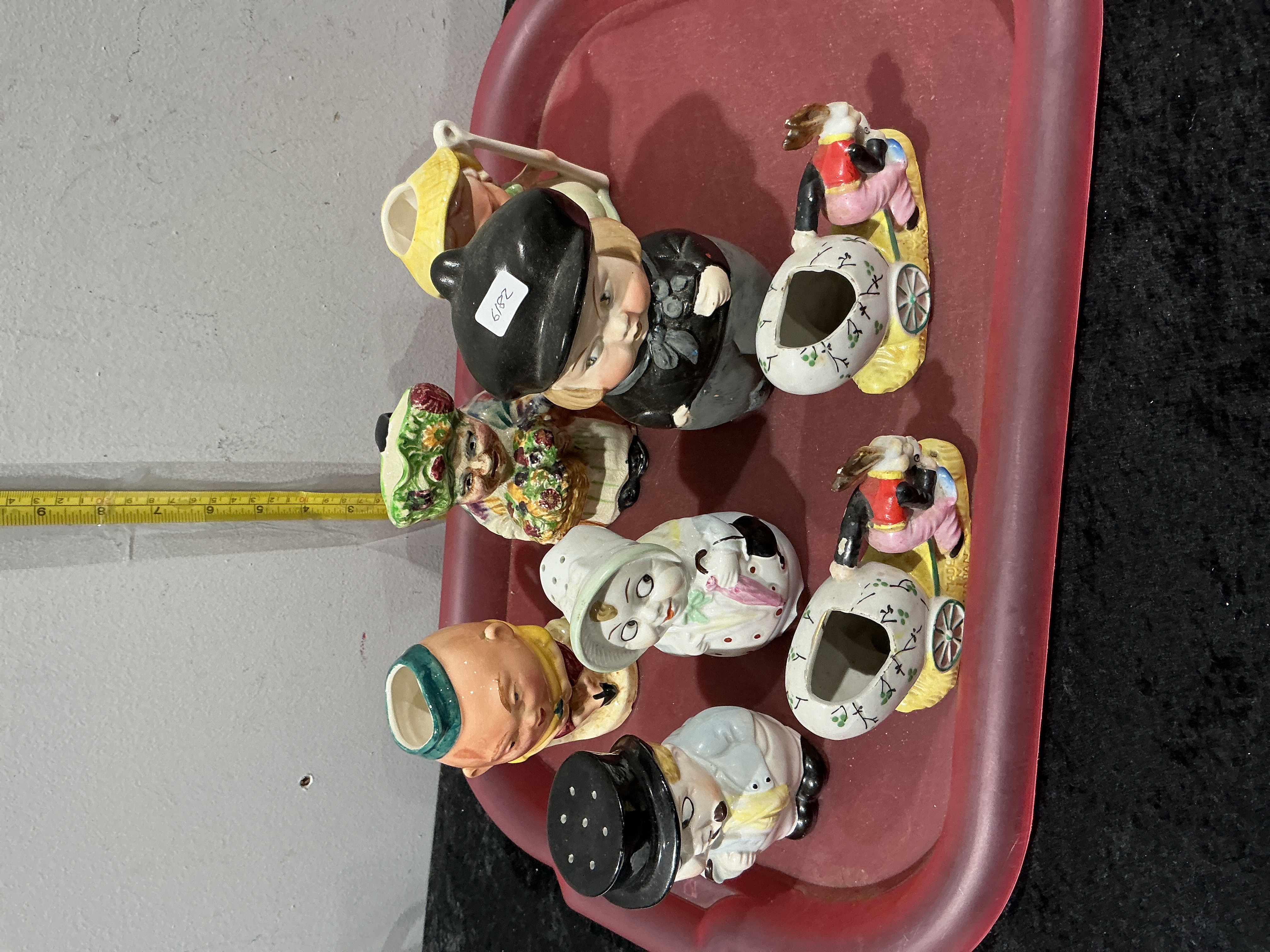 A varied collection of mid-century novelty tablewares and figurines, primarily of Japanese origin. The assortment comprises eight pieces including a pair of anthropomorphic rabbit figures pulling egg-shaped carts, various character-form vessels, and salt and pepper shakers. The items are constructed from molded ceramic with hand-painted overglaze polychrome enamels in a kitsch aesthetic typical of the 1940s to 1960s. Notable pieces include character busts reminiscent of miniature Toby jugs and a Humpty Dumpty style shaker. One rabbit figure retains an original MADE IN JAPAN foil label. The collection reflects the popular export ware produced during the post-war period. Dimensions range approximately from 5 cm to 11 cm in height.