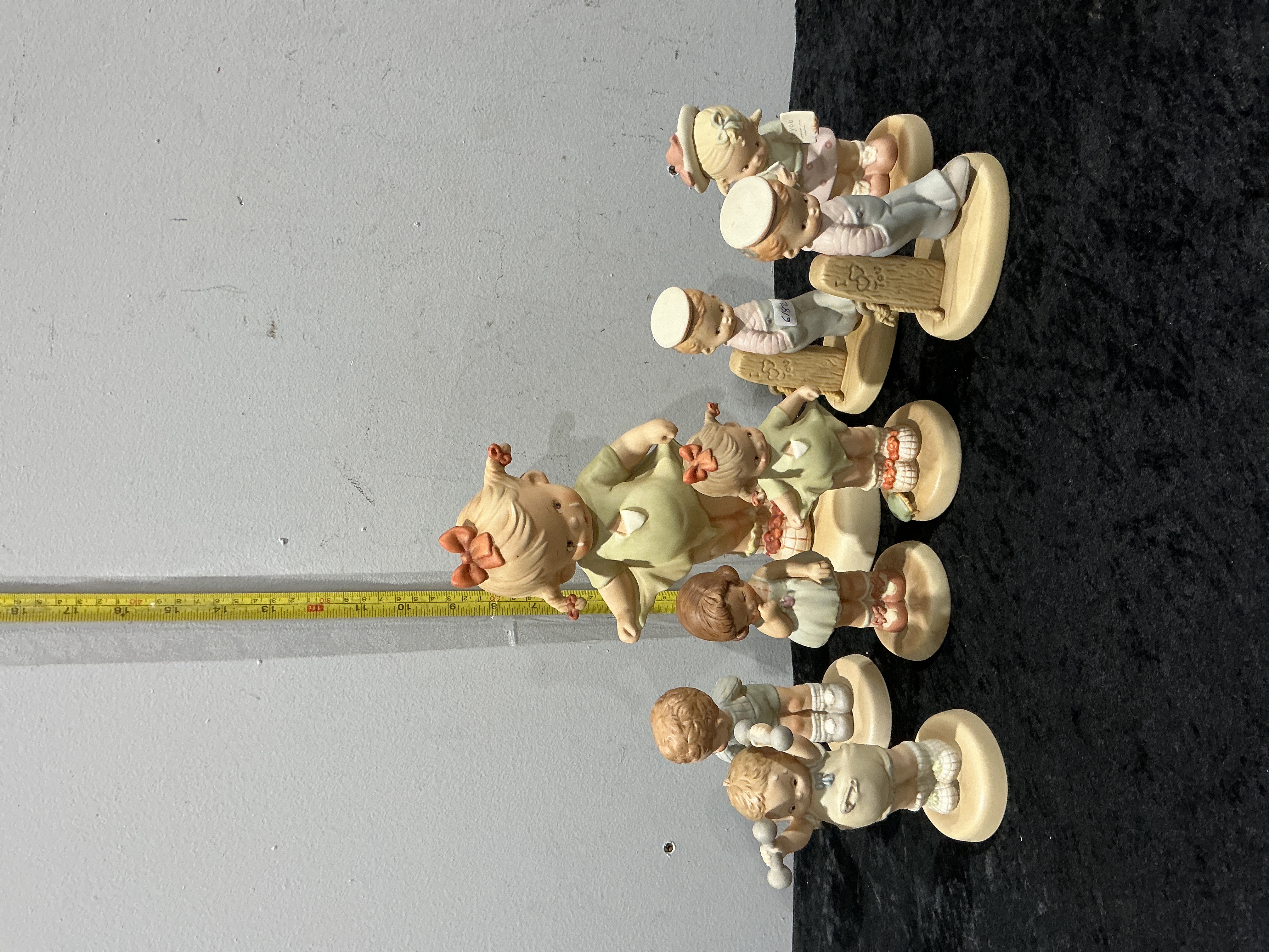 A collection of seven vintage hand-painted matte bisque porcelain figurines from the Enesco Memories of Yesterday series. These whimsical pieces are based on the nostalgic illustrations of British artist Mabel Lucie Attwell. The lot includes Where is Muzzy? (Model 520241, 1988), Ill Keep In Touch (Model 522856, 1991), S-H-H-H-H! (Model 520195, 1988), and Tommy Tears It (Model 522805, 1991), alongside a boy with dumbbells, a girl with a flower basket, and a girl in a white dress. Each piece features comprehensive factory marks on the underside, including model names, numbers, and the characteristic recessed heart symbol. Height approx. 7.5 cm to 15 cm.