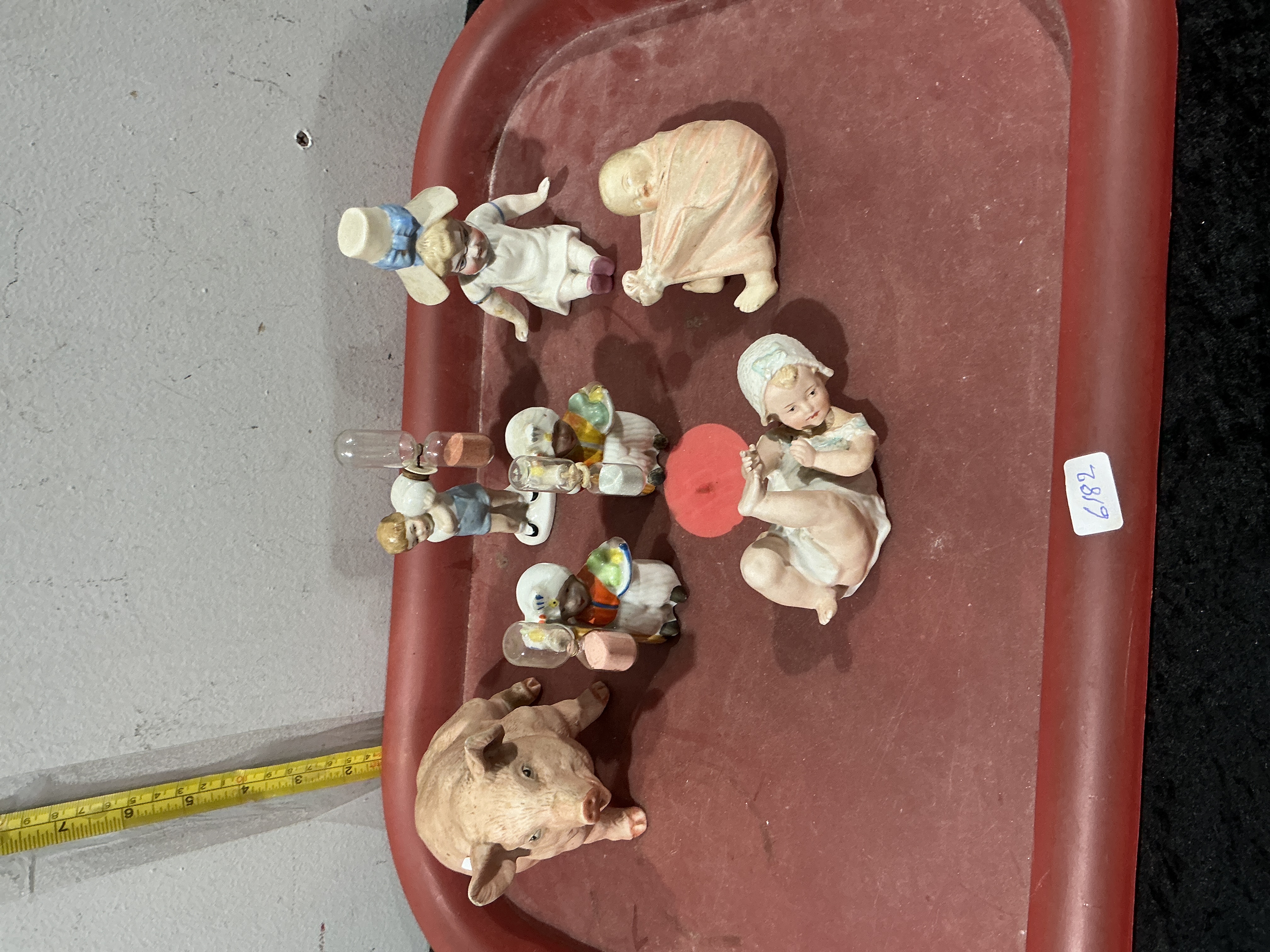 A miscellaneous lot of seven porcelain and ceramic figurines, largely in the style of early 20th-century German decorative collectibles. The lot features a large naturalistic pig figurine with a matte finish and a classic seated ‘Piano Baby’ infant in a white bonnet and lace-trimmed gown. Also included is a small infant figure swaddled in a textured pinkish-tan shawl, and a child figure wearing a wide-brimmed white sun hat with a prominent blue ribbon. The collection is completed by three novelty egg timers, each featuring a small painted figure holding a glass sand vial, including a boy in blue shorts and two smaller brightly coloured figures. Although no factory marks or model numbers are discernible, the bisque items are characteristic of Thuringian production such as Gebruder Heubach. Various heights, largest approximately 12 cm.