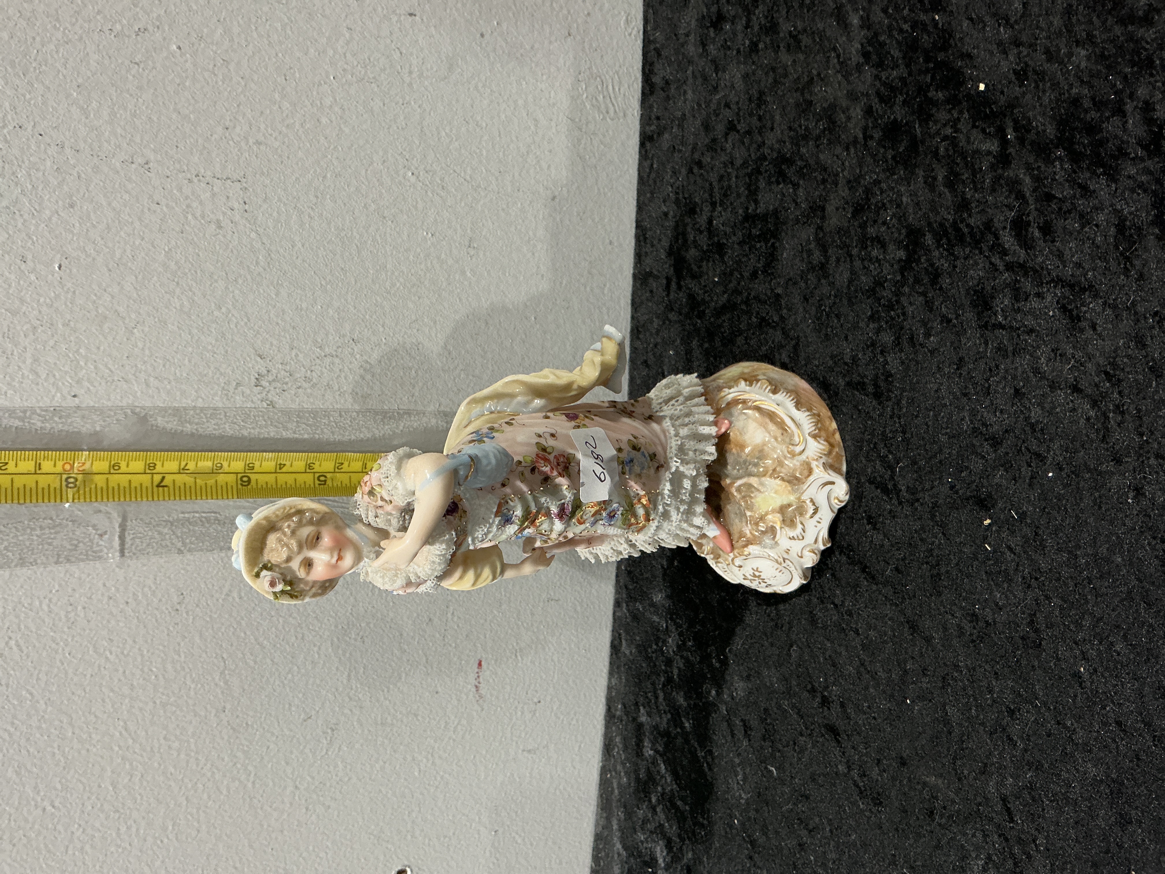Significant loss to the object held in the figure\'s right hand; the handle of what appears to have been a parasol or similar accessory is missing. Typical minor losses and chipping are present throughout the delicate porcelain lace trim on the sleeves and skirt hem. There is a visible chip on the inner rim of the hollow base. The hand-painted floral decoration remains bright. There is minor wear to the gilt highlights on the base and dress. An inventory label marked 2819 is adhered to the figure\'s skirt.