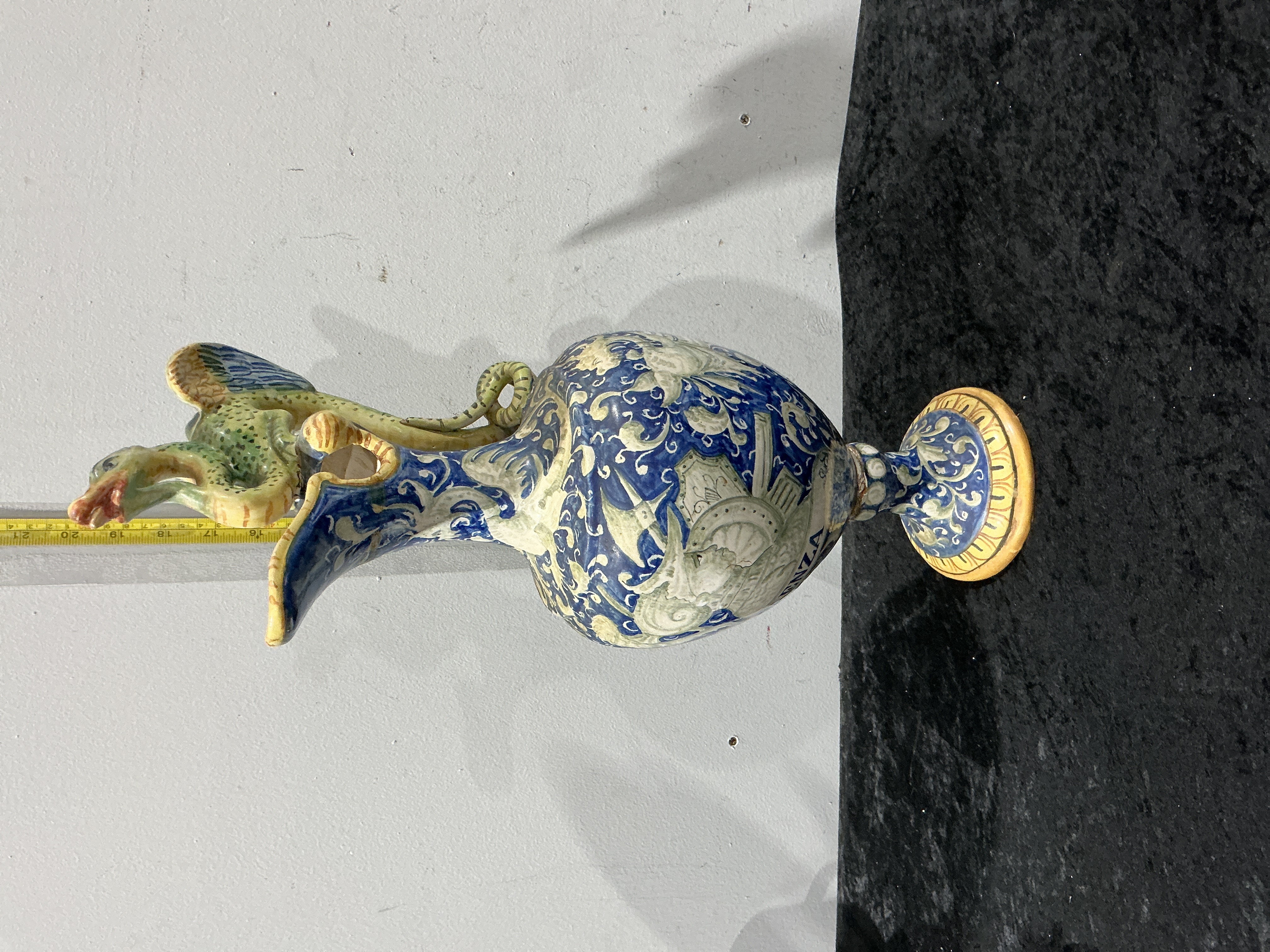 A large Italian Renaissance Revival maiolica ewer, likely dating to the late 19th century. This hand-painted tin-glazed earthenware vessel features an ovoid body decorated with dense blue and white foliate scrollwork. A central white banner is inscribed with the word FAENZA in capital letters, referencing the historic centre of Italian ceramic production. The ewer is further distinguished by a sculptural, polychrome handle modelled in the form of a winged serpent or chimera. The piece sits upon a spreading circular foot finished with an ochre-coloured border. The underside of the foot remains unglazed, showing the buff-coloured earthenware body. Height: approximately 52 cm.