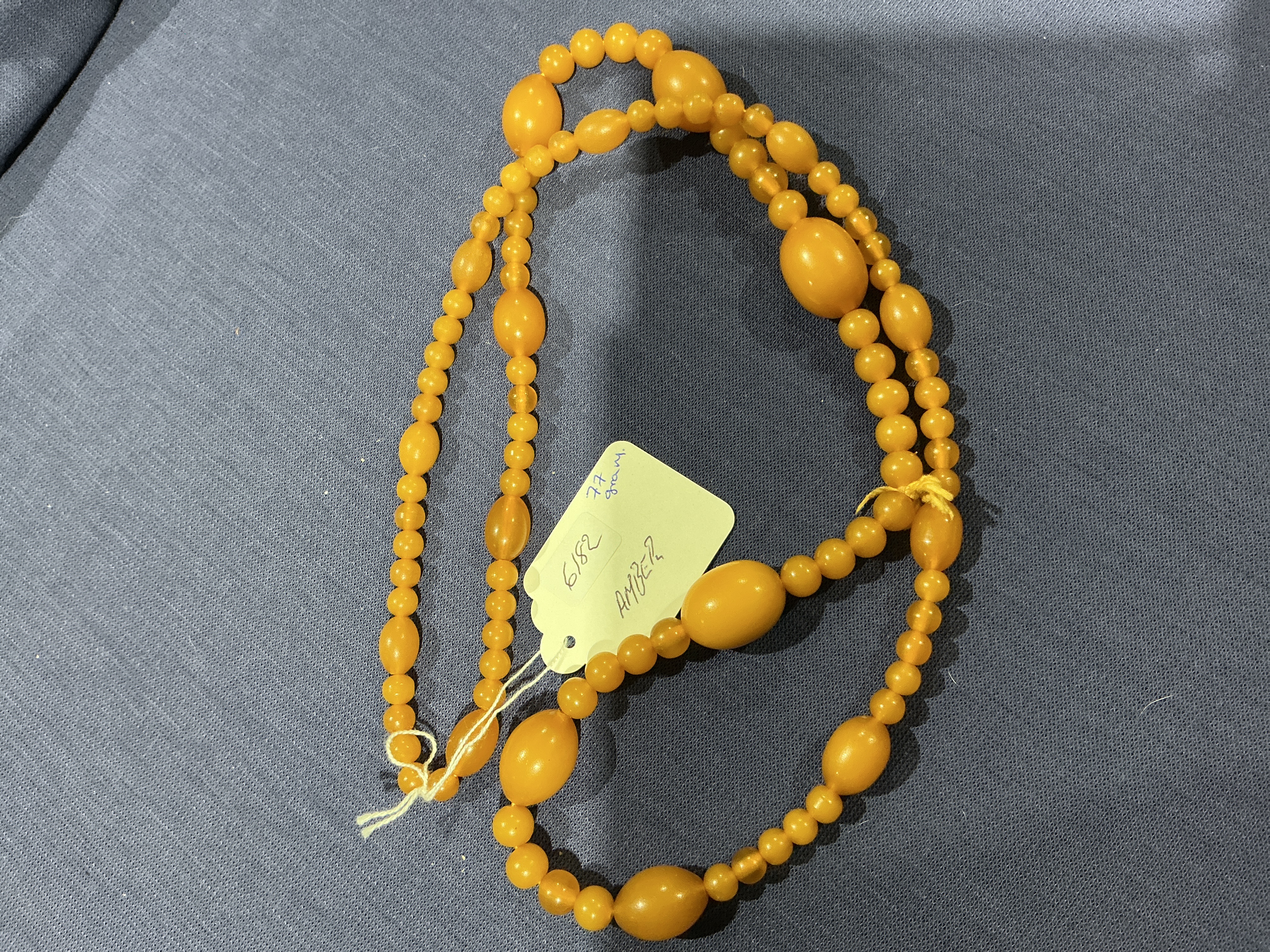 A continuous strung beaded necklace featuring beads that appear to be butterscotch-coloured amber. The design consists of a repeating pattern of large ovoid beads interspersed with smaller spherical beads. The beads exhibit characteristic natural variations in colour and opacity, ranging from opaque egg-yolk yellow to semi-translucent honey tones. The piece is constructed without a clasp or metal components. No hallmarks or maker’s marks are present. Weight: 77 grams.