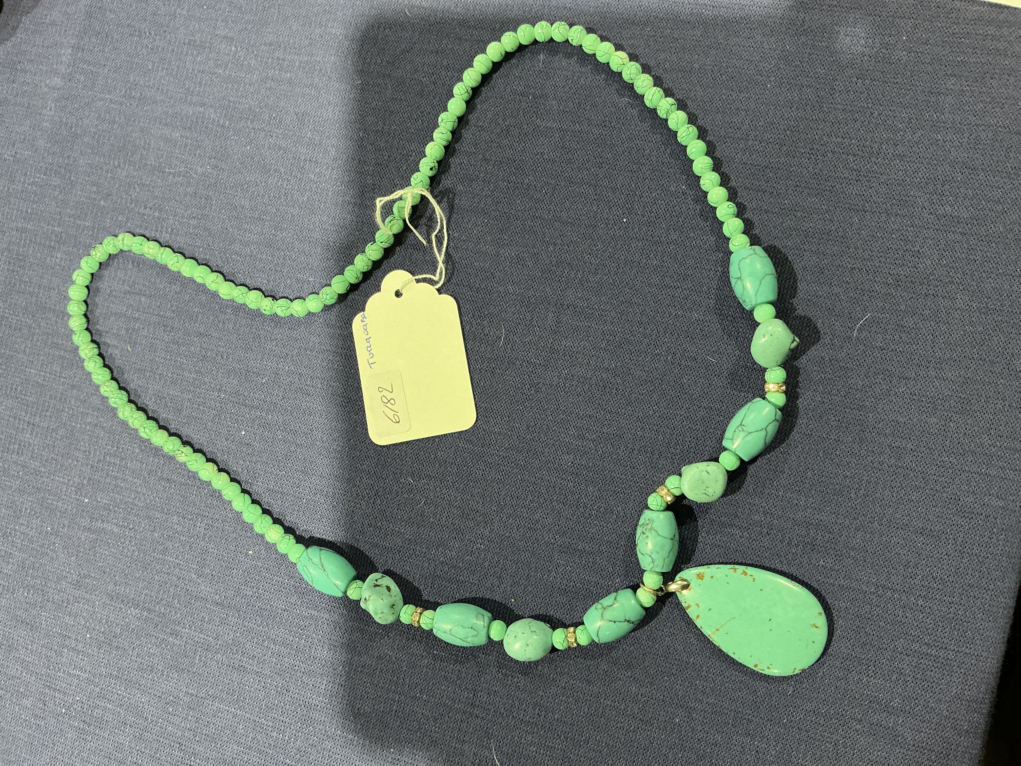A hand-strung beaded necklace featuring vibrant greenish-blue stones turquoise or coloured magnesite. The design consists of a strand of uniform small round beads transitioning into larger, irregularly shaped tumbled nuggets, culminating in a prominent flat teardrop-shaped pendant at the centre. The stones exhibit characteristic dark matrix veining and natural surface variations. Interspersed among the larger focal beads are small, yellow-toned metal rondelle spacers. No metal purity hallmarks or maker’s marks are visible on the piece. The necklace is accompanied by a yellow paper inventory tag. Weight and measurements are not available.