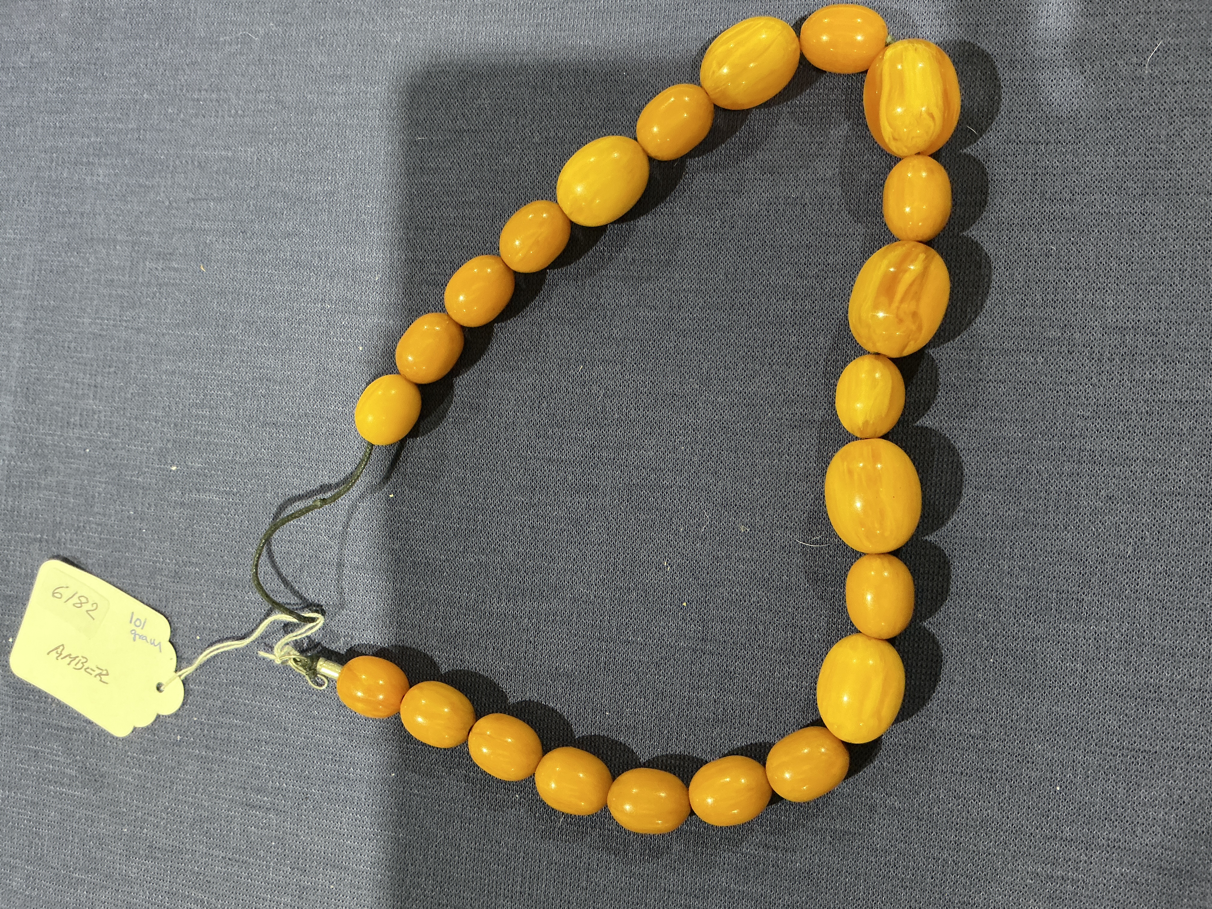 Amber graduated bead necklace featuring twenty-one oval-shaped beads on a dark green cord with a single gold-toned metal ferrule. There is no pendant. The butterscotch amber stones exhibit a saturated yellow colour with internal marbling and swirling. No hallmarks are present. Length approximately 45cm, weight approximately 101 grams.