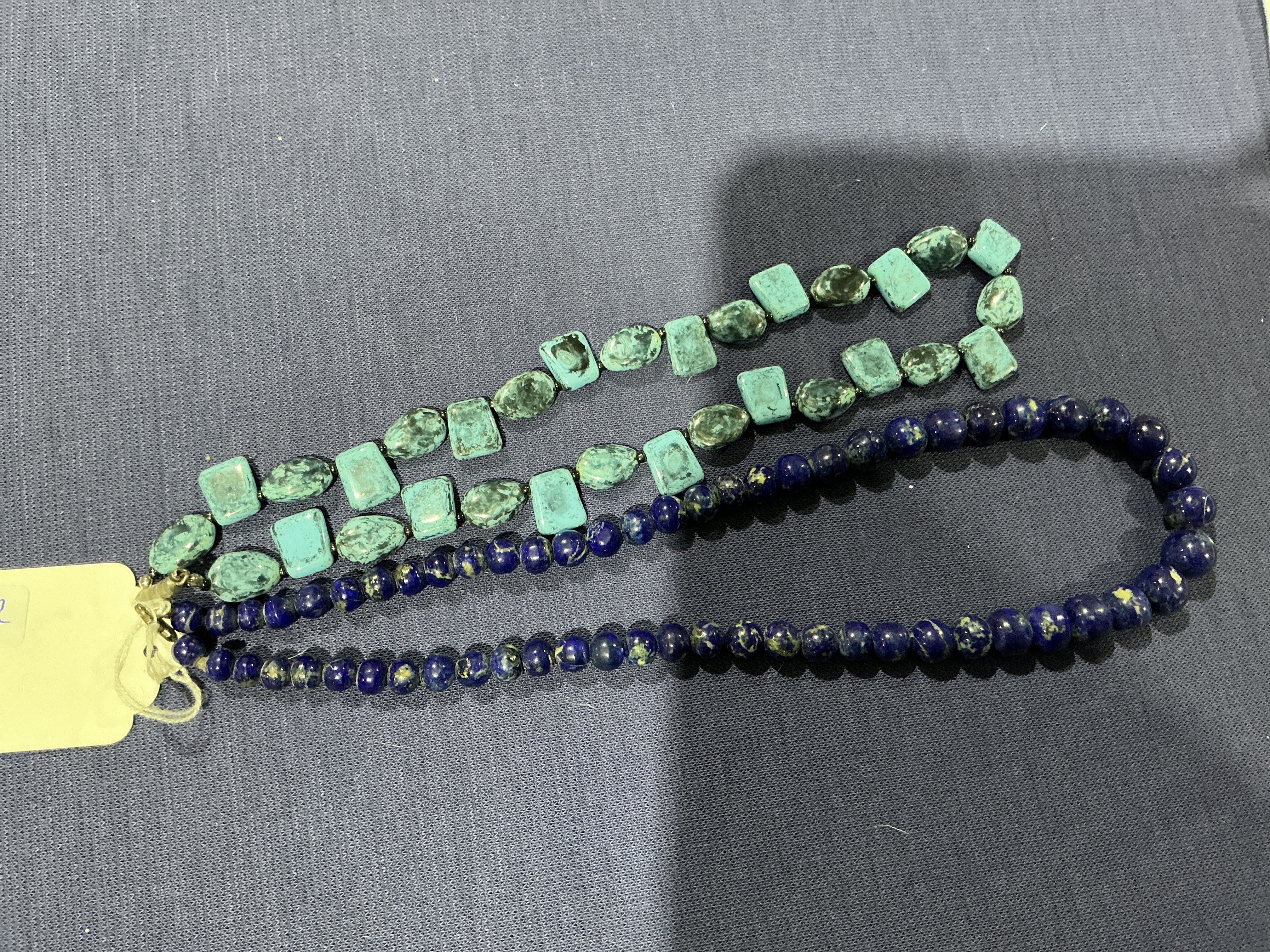 This lot comprises two beaded strands joined at a yellow-toned metal clasp. One strand features stones that appear to be turquoise, cut into alternating rectangular and oval nugget shapes, displaying a range of green and blue-green hues with visible matrix. The second strand consists of round beads that appear to be lapis lazuli, showing a deep blue colour with characteristic inclusions of pyrite and calcite. The metal components appear to be yellow-toned base metal as no hallmarks or purity stamps are visible. The construction is typical of contemporary beaded jewellery. Weight and measurements are not provided as no scale or ruler was present during inspection.