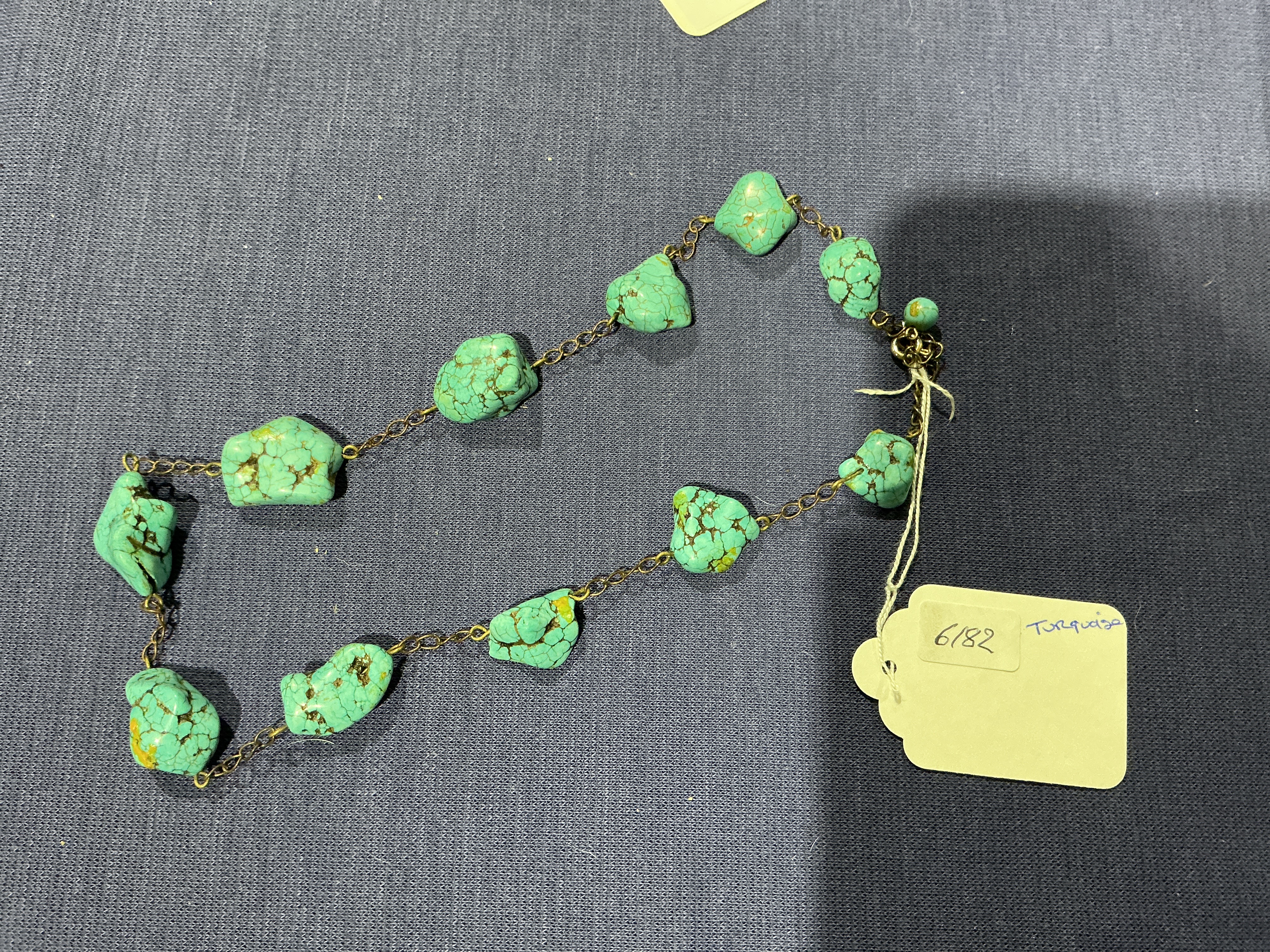 A station necklace featuring a series of nine large, freeform tumbled stones that appear to be turquoise. The stones display a vibrant green-blue colour with prominent brown matrixing and are connected to a dark yellow-tone metal chain via wire loops through drilled centres. The metal appears to be a base metal or brass, as no hallmarks or purity stamps are visible. The necklace terminates in a clasp featuring a small coordinating stone bead. The construction and style suggest a vintage costume jewellery piece. Weight: Not available. Length: Approximately 50 cm.