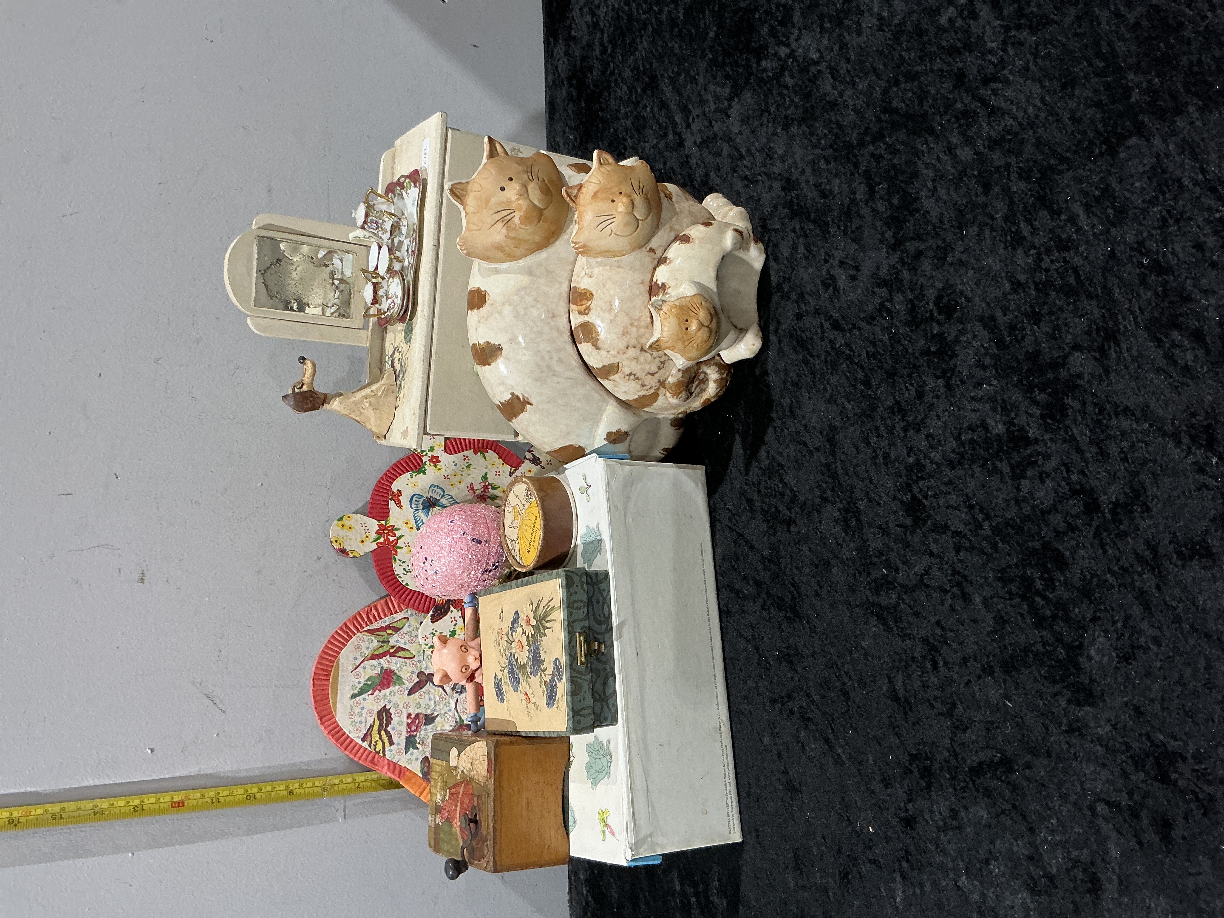 A varied collection of decorative household items and miniatures. The primary piece is a whimsical glazed ceramic figural group depicting a large cat with two kittens nestled against it, finished in a cream glaze with hand-applied brown mottled spots and simple painted facial features. The lot also includes a vintage-style miniature wooden dressing table in cream paint, featuring a fixed upright mirror and a tiny porcelain tea service on the tabletop. Additional items comprise a floral-patterned trinket box with a brass-toned clasp, a small wooden hand-crank music box, two heart-shaped butterfly-patterned fabric coasters with red piping, a small pink pig figurine, a miniature duck, and a textured decorative sphere. No factory marks or signatures are present. Height (cat group) approx. 15cm.