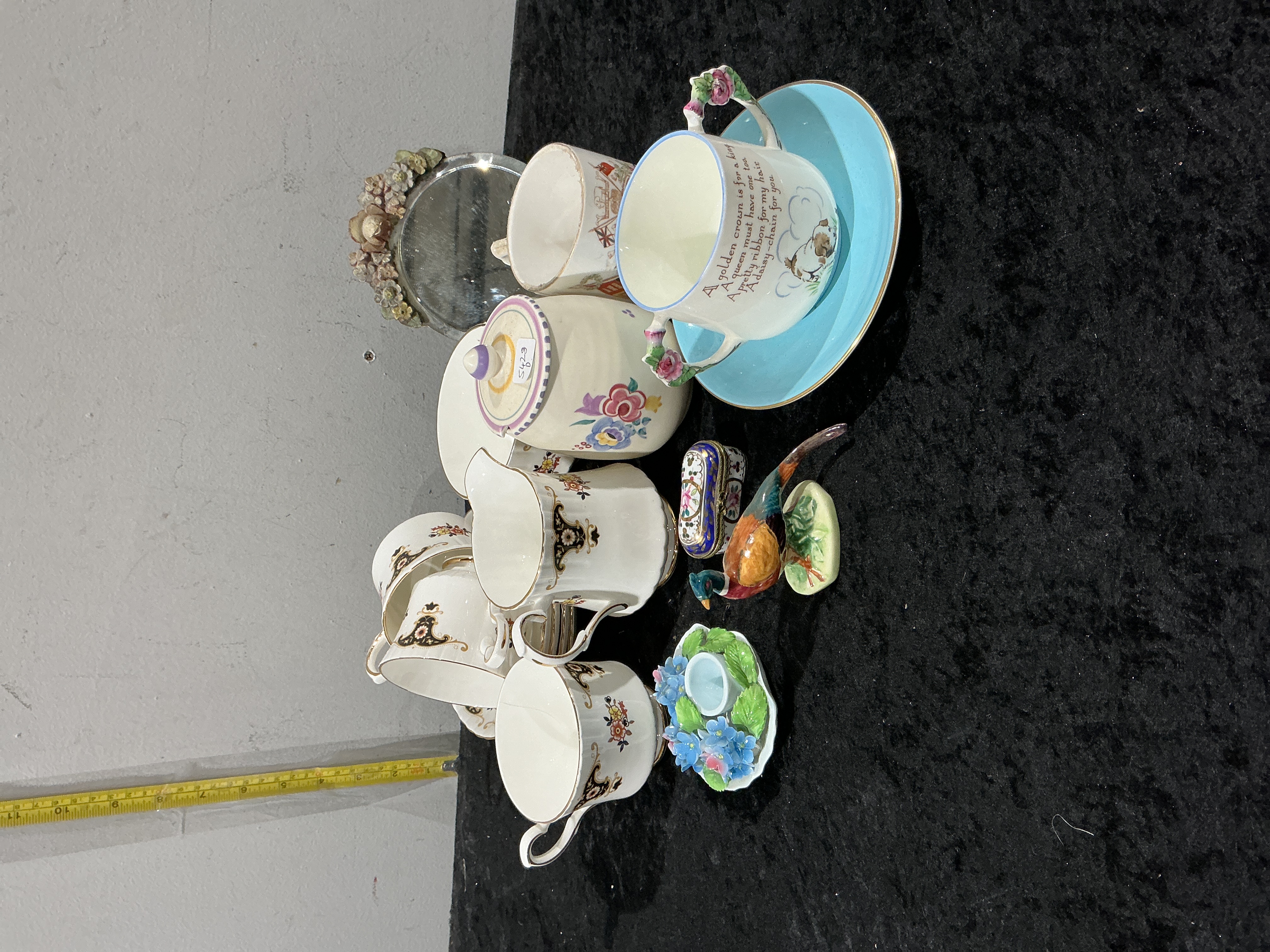 A varied assortment of fine porcelain and decorative ceramic wares, primarily of English and Continental origin. The collection features a notable Wedgwood ‘Fortune’ series teacup and saucer in a vibrant turquoise glaze, decorated with a transfer-printed nursery rhyme and floral-moulded handles. Also included is a partial tea service, likely Crown Staffordshire, comprising several teacups, saucers, a cream jug, and a lidded sugar bowl, all featuring hand-painted floral sprays, scrolling gilt borders, and scalloped rims. The lot further contains a small hinged porcelain trinket box with floral motifs, a hand-painted bird figurine, a miniature floral-encrusted dish, and a circular vanity mirror embellished with a frame of applied polychrome ceramic flowers in the Dresden style. Various techniques are represented, including overglaze enamelling, gilding, and intricate applied ceramic work. Largest item (mirror) approximately 12 cm in diameter; overall group width as displayed approximately 30 cm.