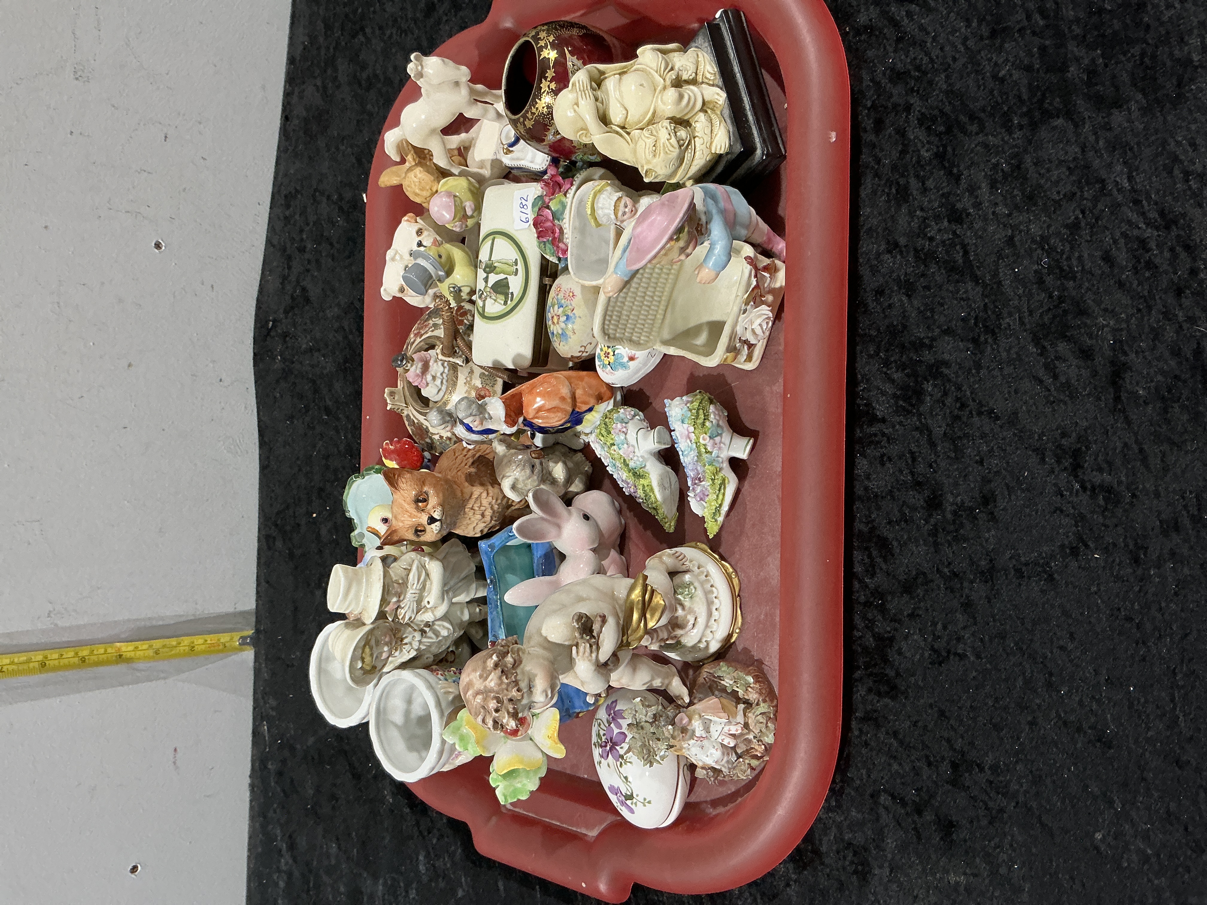 This lot comprises a varied collection of approximately 25 miniature ceramic, porcelain, and resin decorative items. Subject matter includes animals such as a rearing white horse, a seated orange cat, a small pink rabbit, a teddy bear, and a bird. Human figures feature a cherub, an oriental-style seated deity on a dark base, a boy with an open basket trinket box, and a couple in traditional European attire. Decorative objects include several egg-shaped and oval trinket boxes with floral motifs, a pair of miniature boots with three-dimensional applied flowers, a small dark red and gold-gilt miniature vase, and two small white ceramic vessels. The collection also includes a rectangular white ceramic box with a green graphic on the lid. Materials are primarily glazed porcelain and unglazed bisque ceramic, with one figure in carved-style resin. No definitive manufacturer marks are visible. Height: 2cm to 12cm.