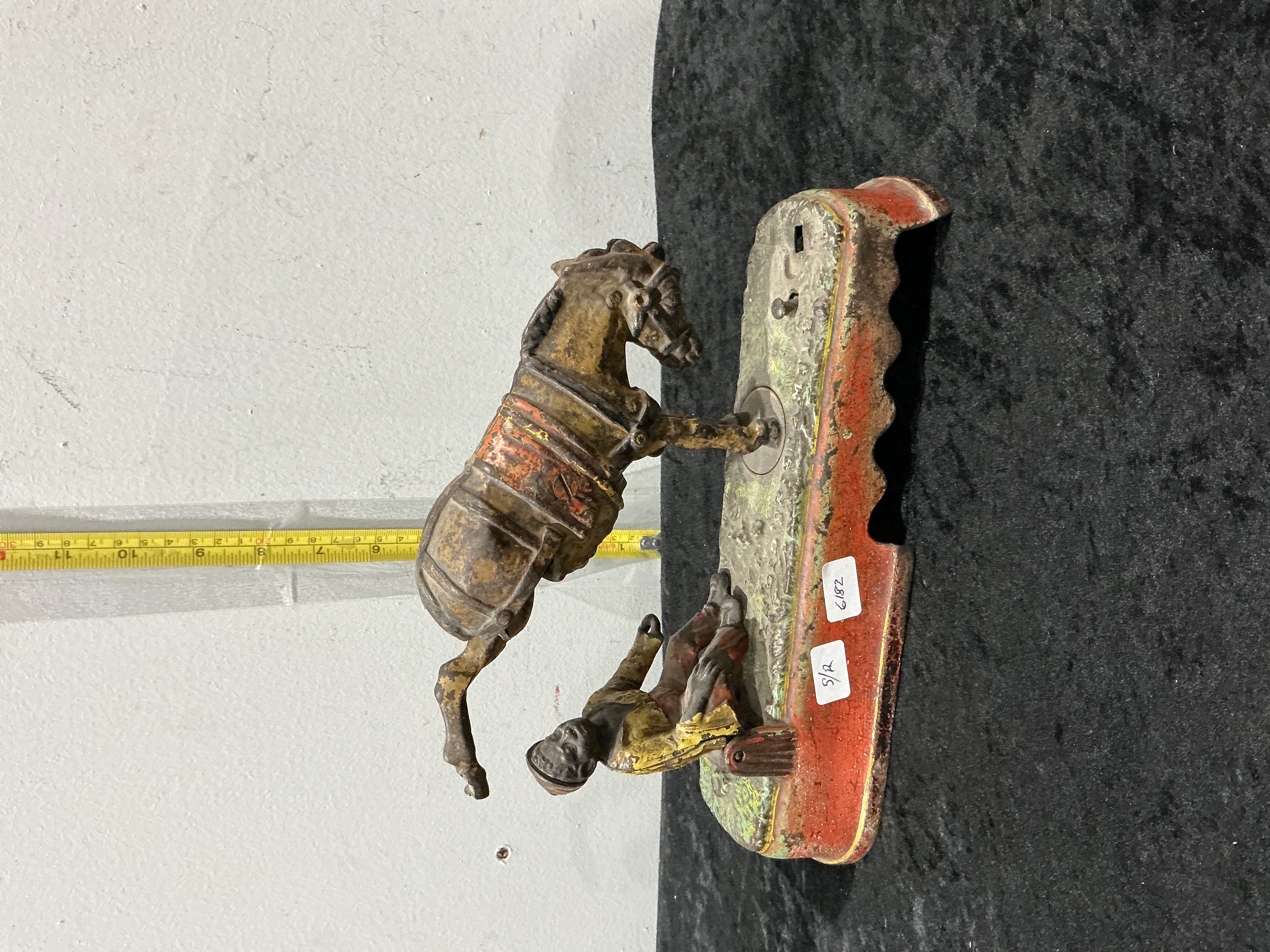 An antique late 19th-century mechanical bank manufactured by the J. & E. Stevens Co. of Cromwell, Connecticut, based on the 1879 patent. Known as the “I Always Did ‘Spise a Mule” kicking mule version, the piece is constructed from hand-painted polychrome cast iron. The design depicts a mule reared on its front legs over a seated figure; the mechanism is designed to rotate the mule to kick the figure and deposit a coin into the base. No factory marks are present. Height: 18 cm.