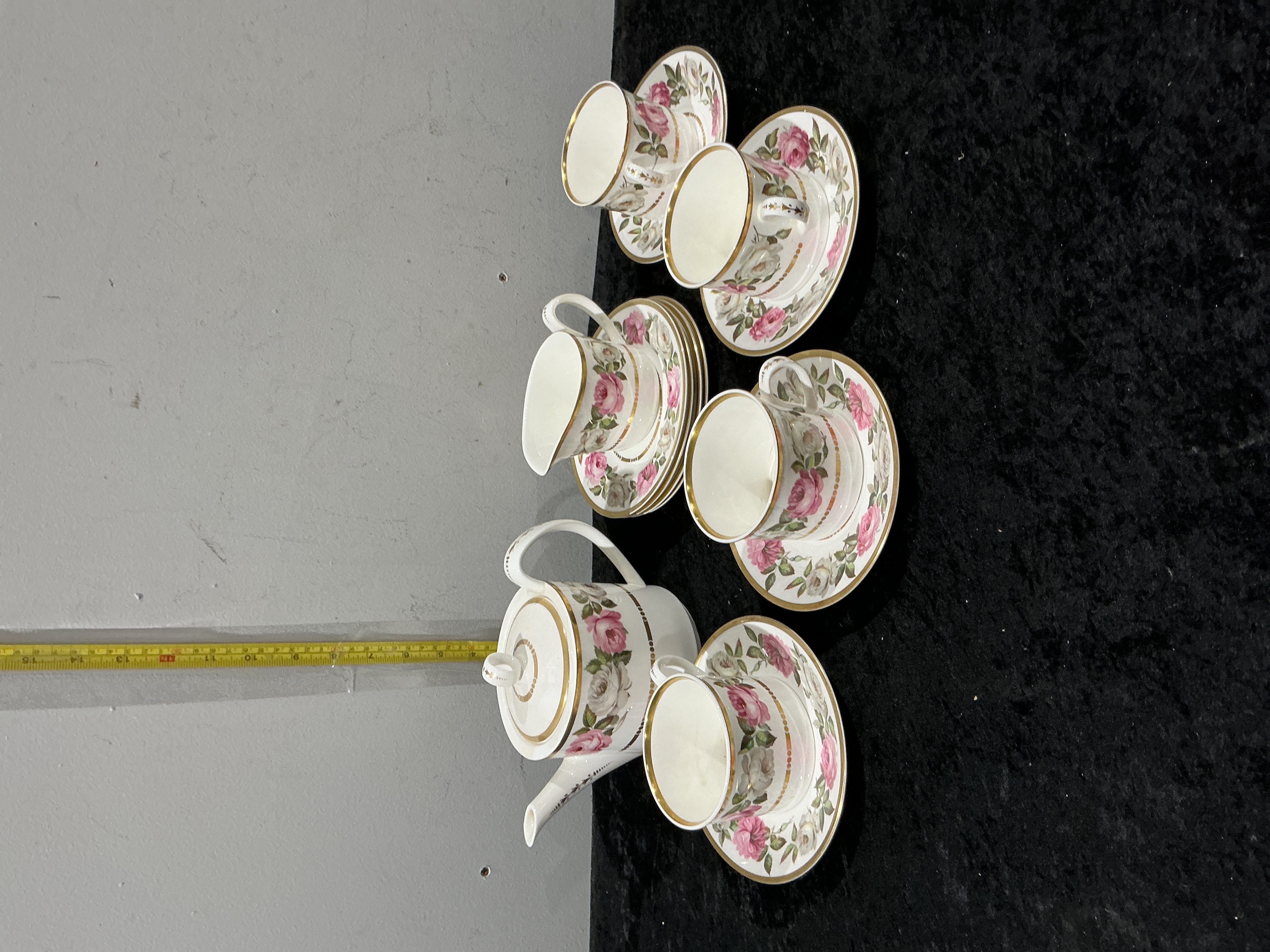 A partial tea service manufactured by Royal Worcester, England, in the Royal Garden pattern. The set is crafted from fine bone china and features transfer-printed floral motifs of pink and white roses with green foliage. The design is accented by gilded rims and gold highlights on the handles and bases, including a distinctive dot and dash gold line to the inner rims. The collection consists of one teapot with lid, one creamer, five teacups, and eight saucers. Each piece is marked to the underside with the red Royal Worcester backstamp, which reads ROYAL WORCESTER FINE BONE CHINA ENGLAND, alongside the pattern name and the copyright date of 1969. Teapot height approximately 15 cm.