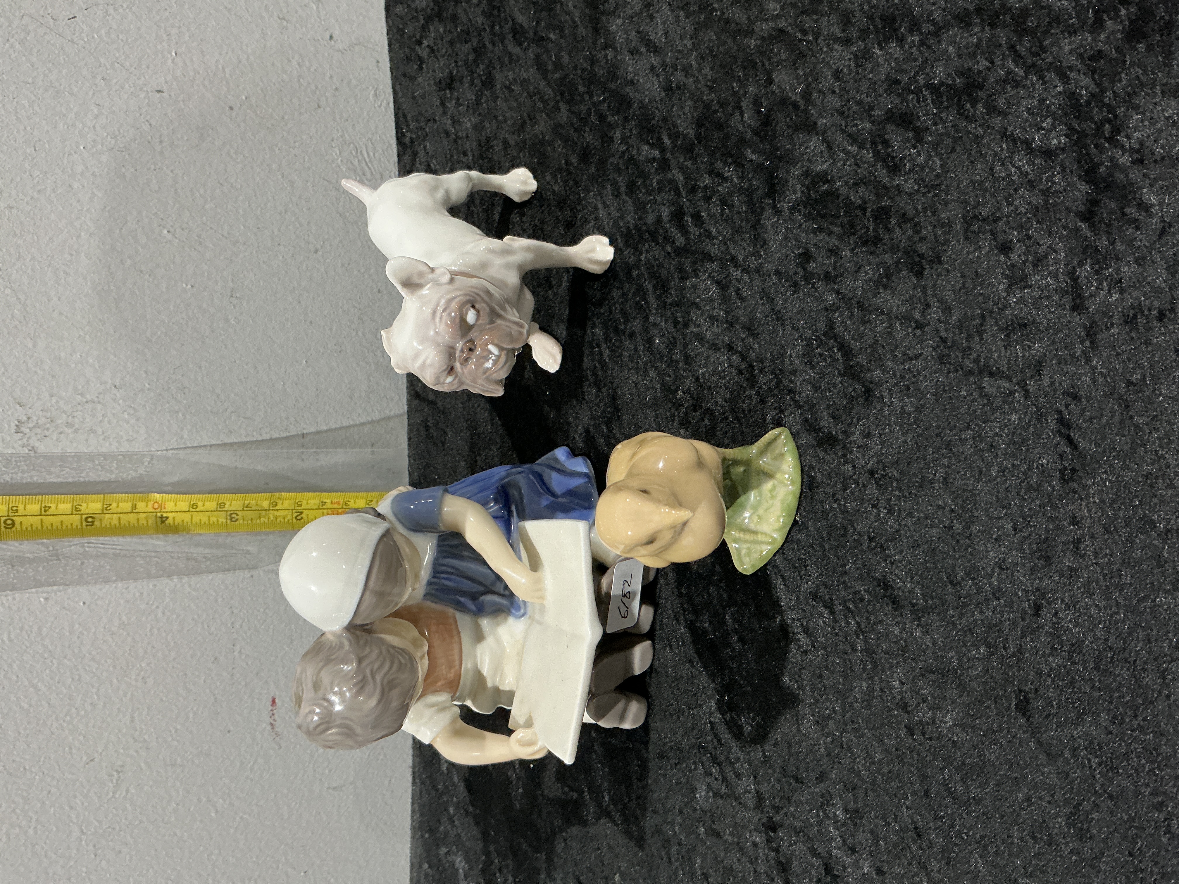 Generally good condition across all pieces. The \'Children Reading\' figurine shows minor shelf wear to the unglazed foot rim. The dog and bird figurines are in excellent condition with no visible chips, cracks, or repairs.