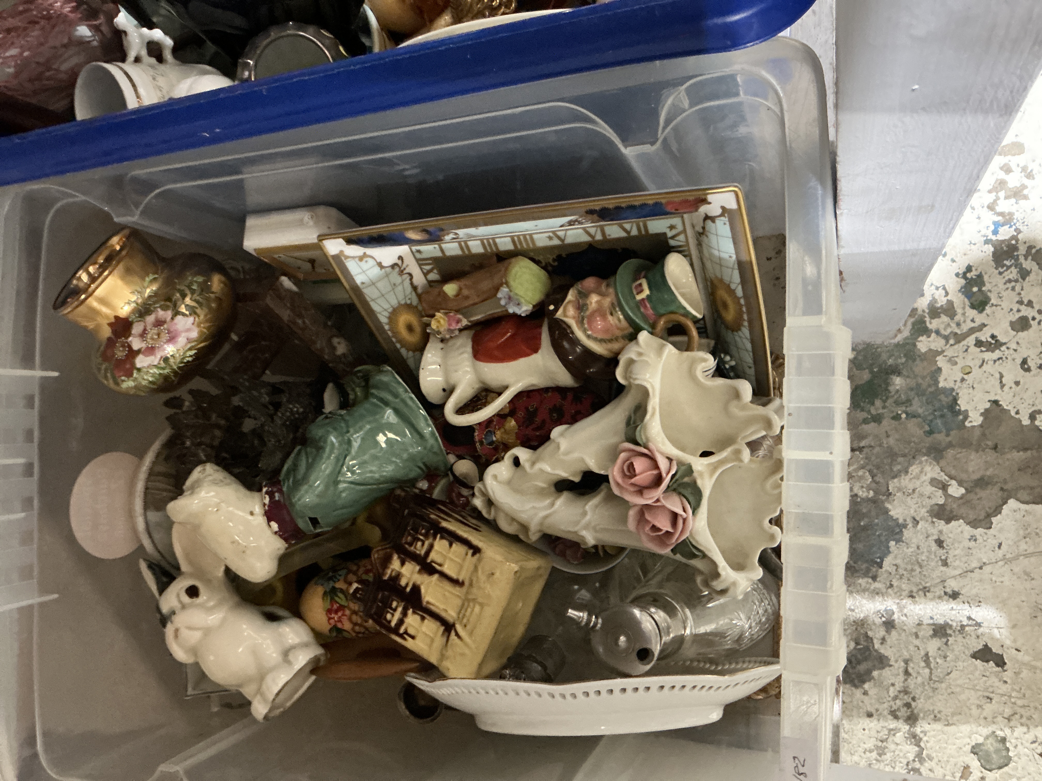 A mixed collection of decorative objects and small collectibles, primarily comprising glazed ceramic, porcelain, and glass pieces. The grouping includes a small ceramic vase featuring a gilded neck and hand-painted floral motifs, a ceramic Toby-style character jug, and a white porcelain vase with applied three-dimensional pink roses and a ruffled rim. Also present is a white ceramic rabbit figurine, a small ceramic architectural-form piece, and a square porcelain dish or tile featuring a transfer-printed world map and clock-face design with gilded highlights. Further items include a pressed glass shaker with a metal cap and a white porcelain plate with a reticulated border. The collection exhibits various decorative techniques including moulding, hand-painting, and transfer-printing, with styles ranging from Victorian-influenced to mid-20th-century decorative arts. No maker’s marks or signatures are visible. Measurements unavailable.