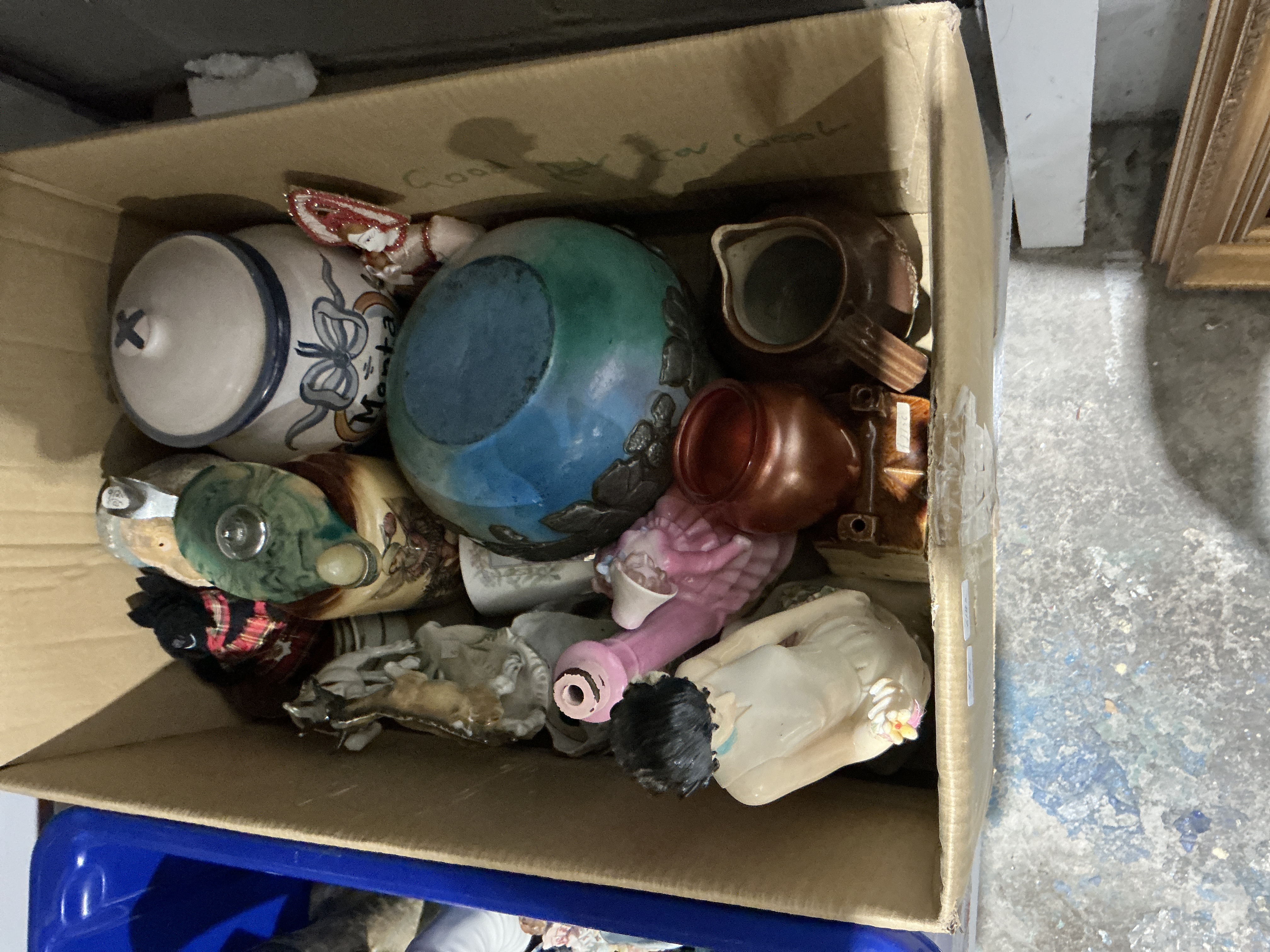 A diverse assortment of decorative ceramic and pottery items, primarily of British and European origin, suitable for restoration or study. The collection includes a large bulbous vessel featuring a vibrant green and blue glaze with molded relief decoration at the base, characteristic of Poole Pottery or similar studio ware. Also featured is a white ceramic lidded jar decorated with hand-painted blue script and bow motifs in a traditional faience style. The lot contains various small pitchers and vessels finished in a range of high-gloss brown, orange, and red glazes, alongside a selection of polychrome ceramic figurines, notably a standing female figure in a white dress holding flowers and several small animal-form figures. Techniques represented include hand-painting, slip-casting, and various glaze applications from matte to high-gloss. The items reflect styles from the early 20th century through to the Mid-Century Modern period. Dimensions variable.