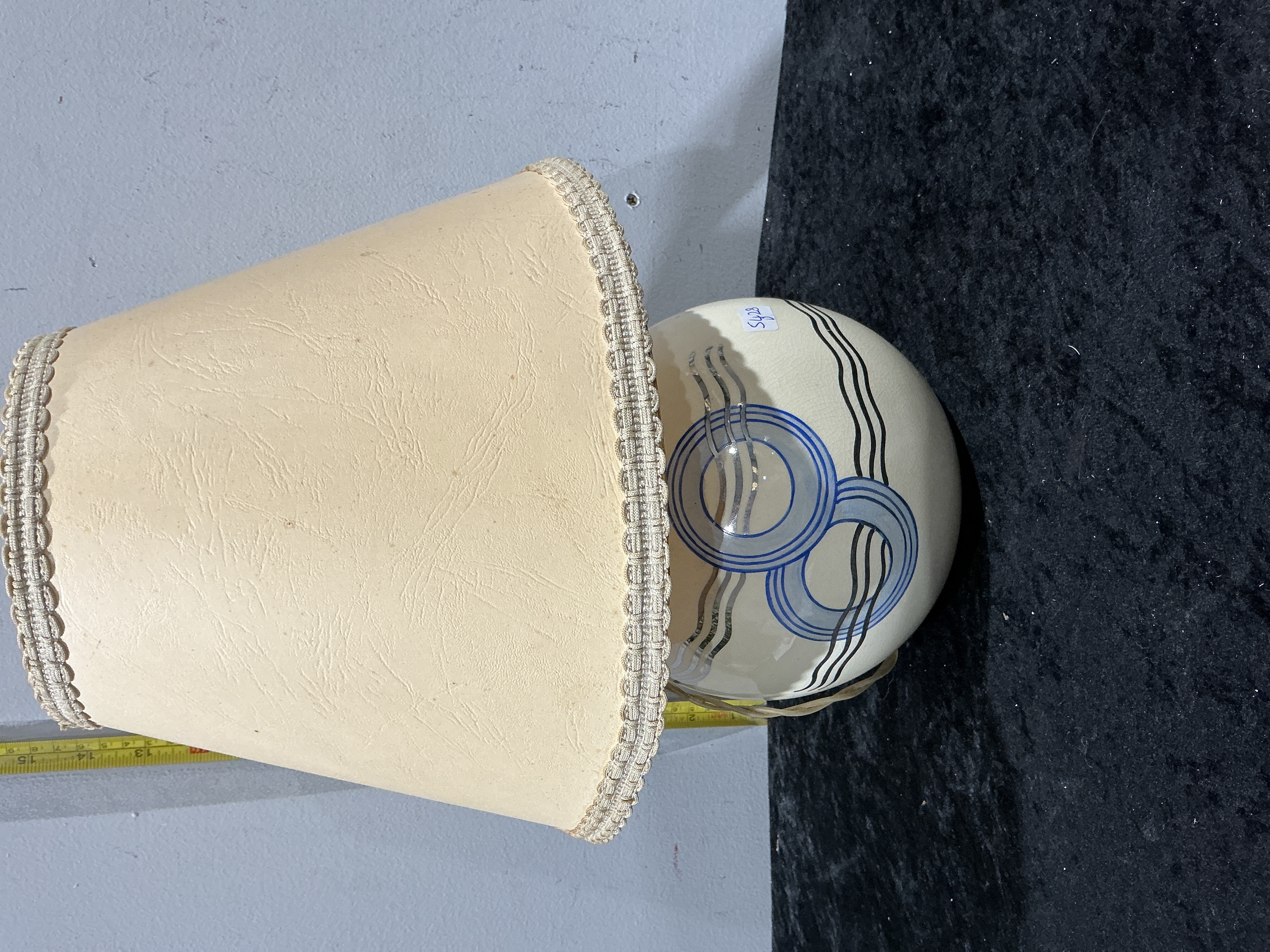 A vintage table lamp produced by Waite & Son Ltd of Mitcham, Surrey, featuring a spherical ceramic base. The body is finished in a cream-coloured glaze and decorated with hand-painted Art Deco motifs, including concentric circles and wavy lines in a palette of blue and silver. The underside of the base bears the manufacturer’s trade mark alongside the words HAND PAINTED and various hand-painted artist initials and numerals. The lamp is fitted with a tapered parchment-style shade, finished with a decorative braided fabric trim to the upper and lower edges. Height: approximately 38 cm.