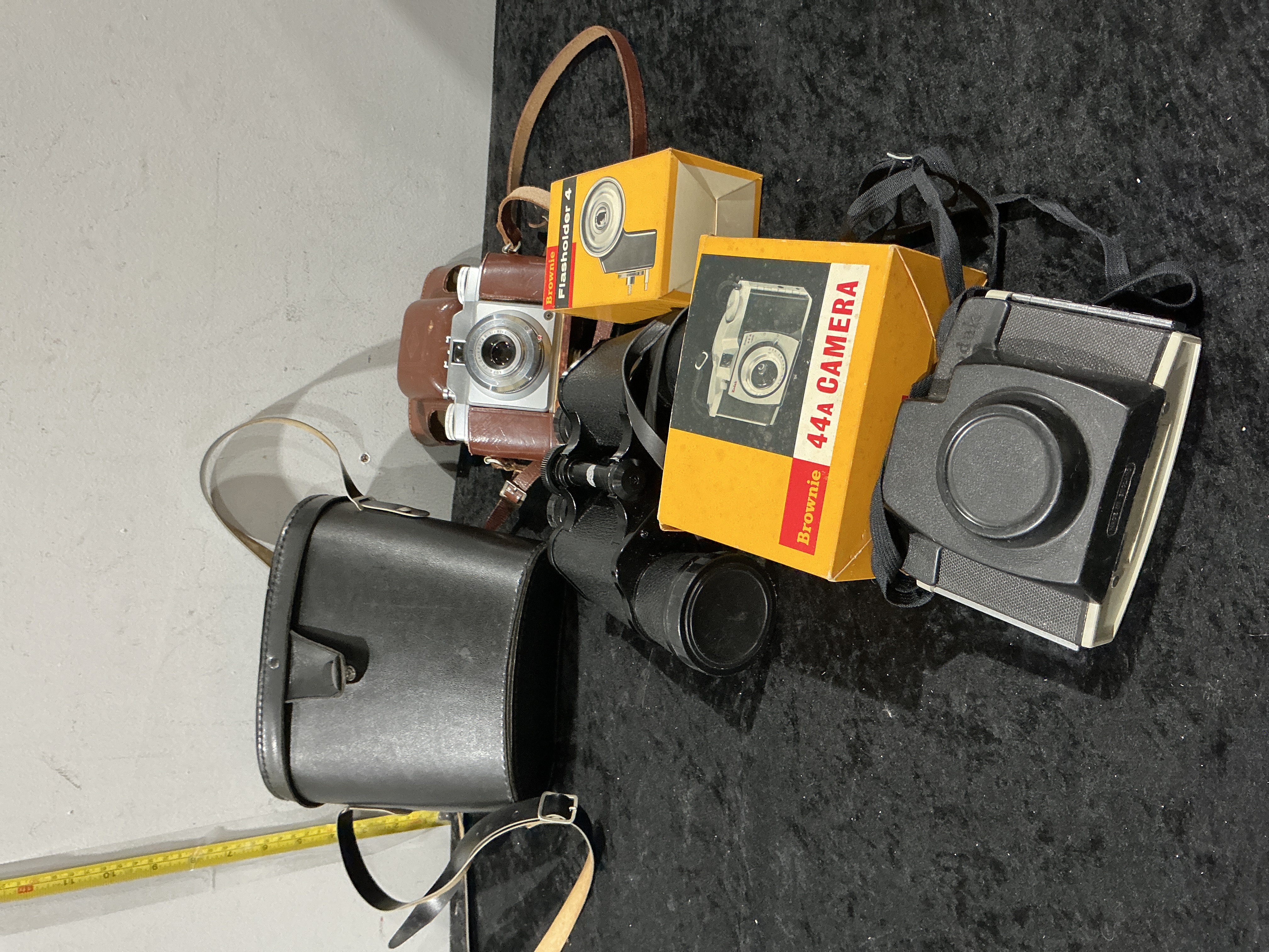 This lot features a collection of mid-century photographic equipment and optics. Item 1: Kodak Brownie 127 (Second Model, circa 1959-1963). Format: 127 roll film. Lens: Fixed-focus Dakon lens. Body: Black plastic with silver-tone metal faceplate. Accessories: Brown leather ever-ready carrying case with shoulder strap. Item 2: Kodak Brownie 44A Camera Outfit (circa 1959-1966). Format: 127 roll film. Lens: Fixed-focus Dakon lens. Body: Two-tone black and off-white plastic. Accessories: Original yellow and red retail box and a black moulded plastic ever-ready carrying case with strap. Item 3: Kodak Brownie Flasholder 4, a battery-operated flash unit accessory. Accessories: Original yellow retail box. Item 4: Soulus Porro prism binoculars. Body: Black metal with textured grip. Accessories: Large black hard-shell carrying case with shoulder strap.