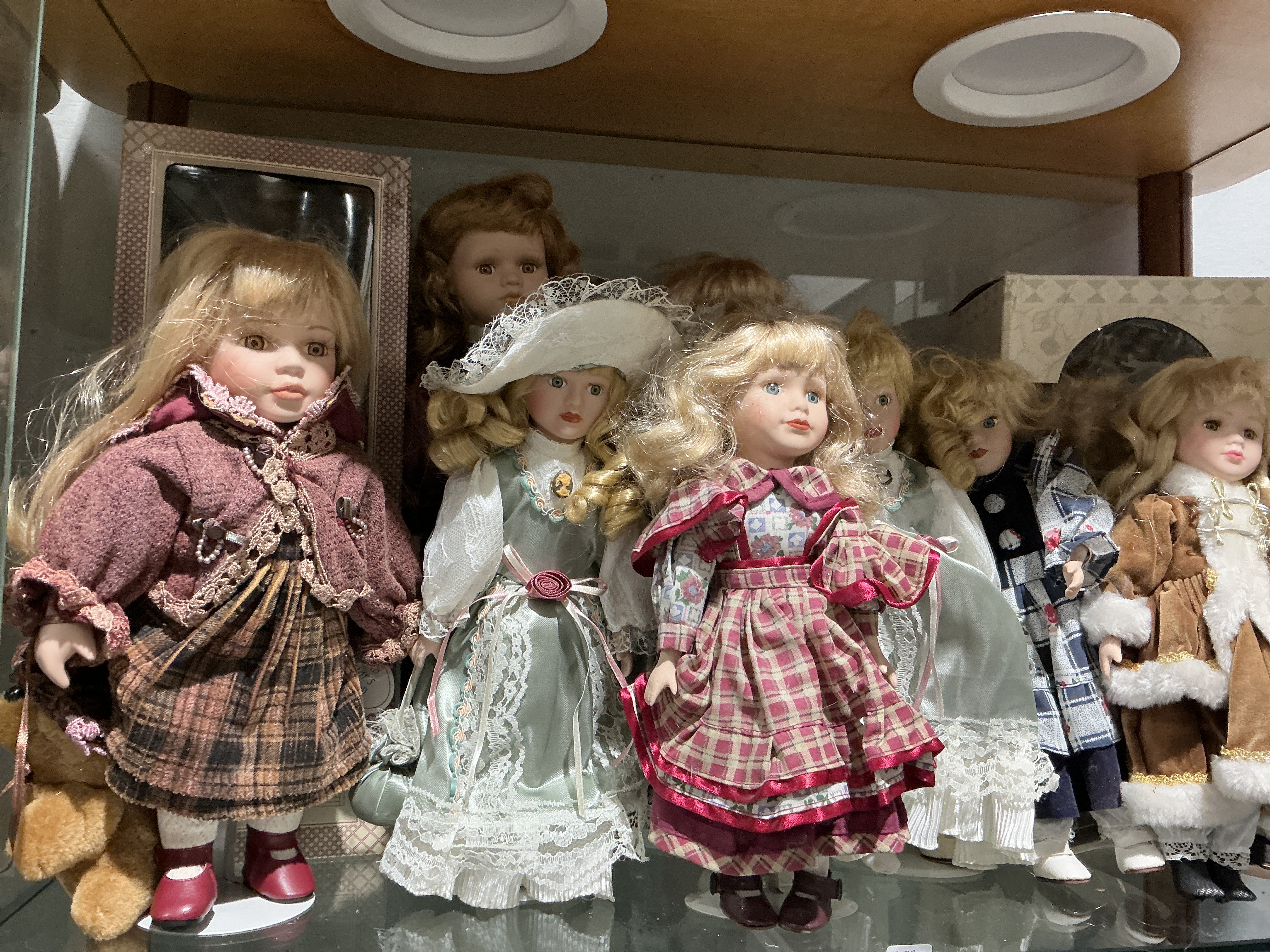 A collection of seven late 20th-century decorative dolls, typical of mass-produced series by makers such as Heritage Mint, Collector’s Choice, or Geppeddo. Each doll features a bisque porcelain head and hands with a soft-filled cloth body. Maker marks are not visible but are typically located on the back of the neck. Features include fixed inset acrylic eyes with applied eyelashes and synthetic fibre wigs in various shades of blonde and auburn. The dolls are dressed in their original, elaborate multi-layered period-style costumes, including Victorian lace dresses, plaid ensembles, and a winter-themed velvet-style coat with faux-fur trim. One doll is accompanied by a small plush bear. Height 10 to 14 inches.